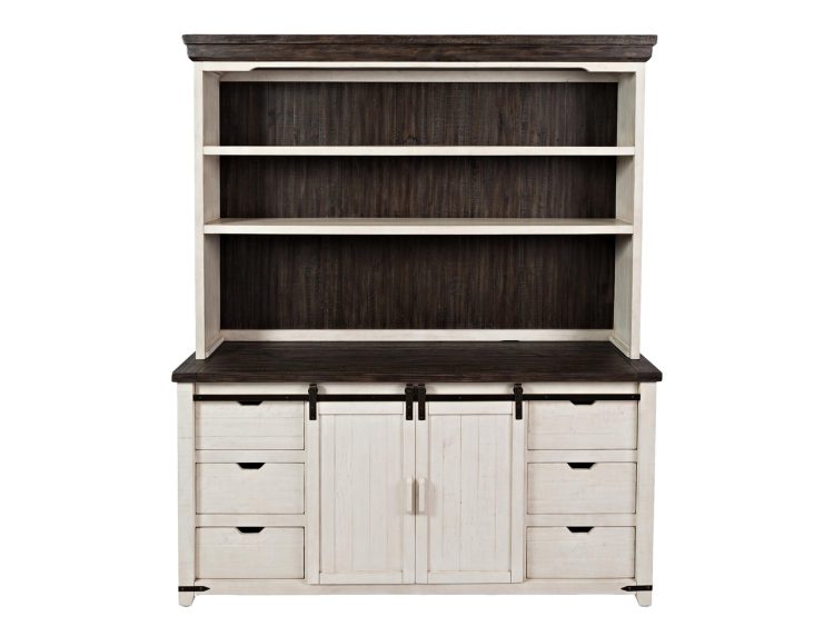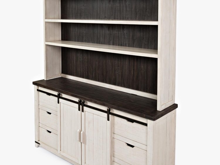 - Kredensy z elementami drewna – łączące biel z naturalnym blatem lub nóżkami.