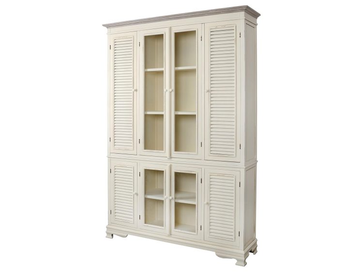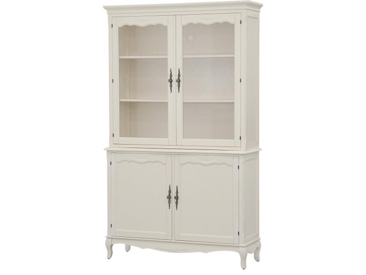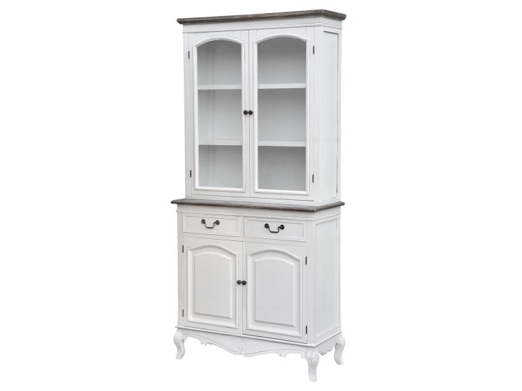 - Białe kredensy z witryną – idealne do ekspozycji porcelany lub szklanych naczyń.
