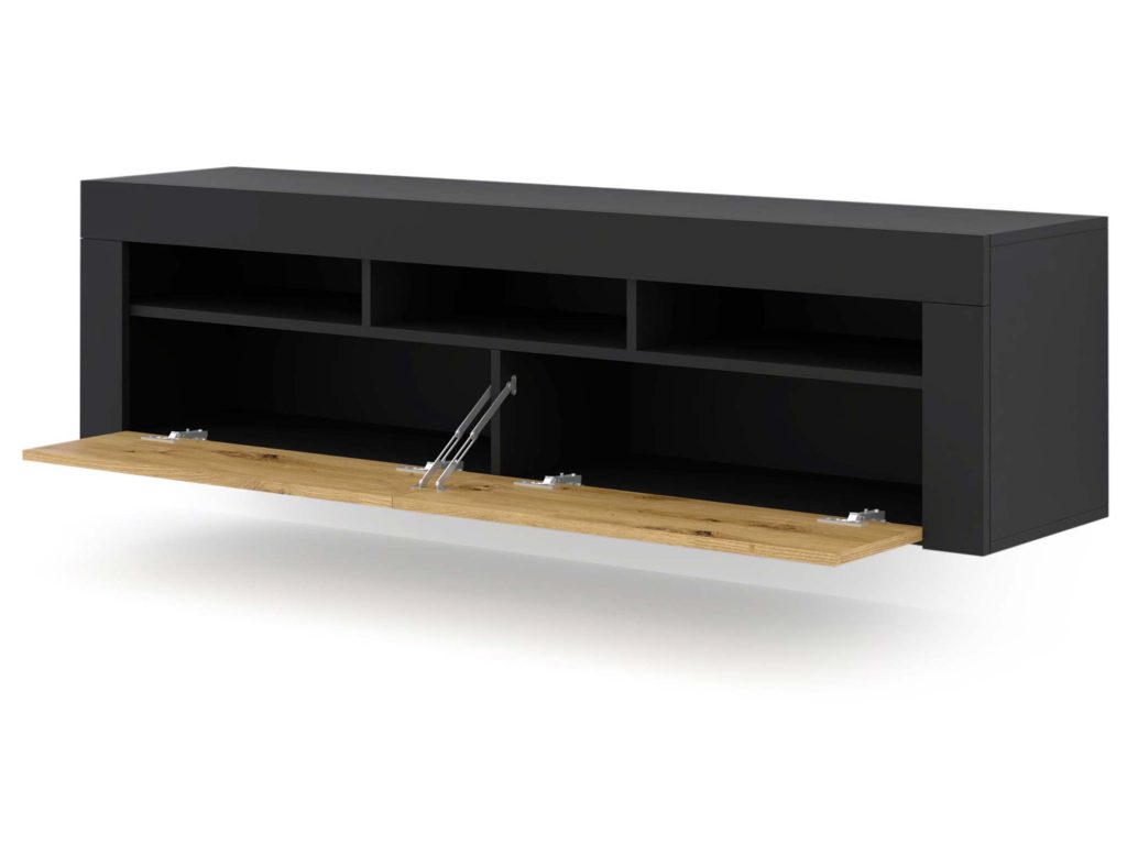 Wnętrze szafki zostało zaprojektowane z myślą o nowoczesnym użytkowniku. Trzy otwarte wnęki mieszczą dekodery, konsole i soundbary. Dodatkowa zamknięta przestrzeń umożliwia przechowywanie kabli, ładowarek czy dokumentów. Wszystko ma tu swoje miejsce.