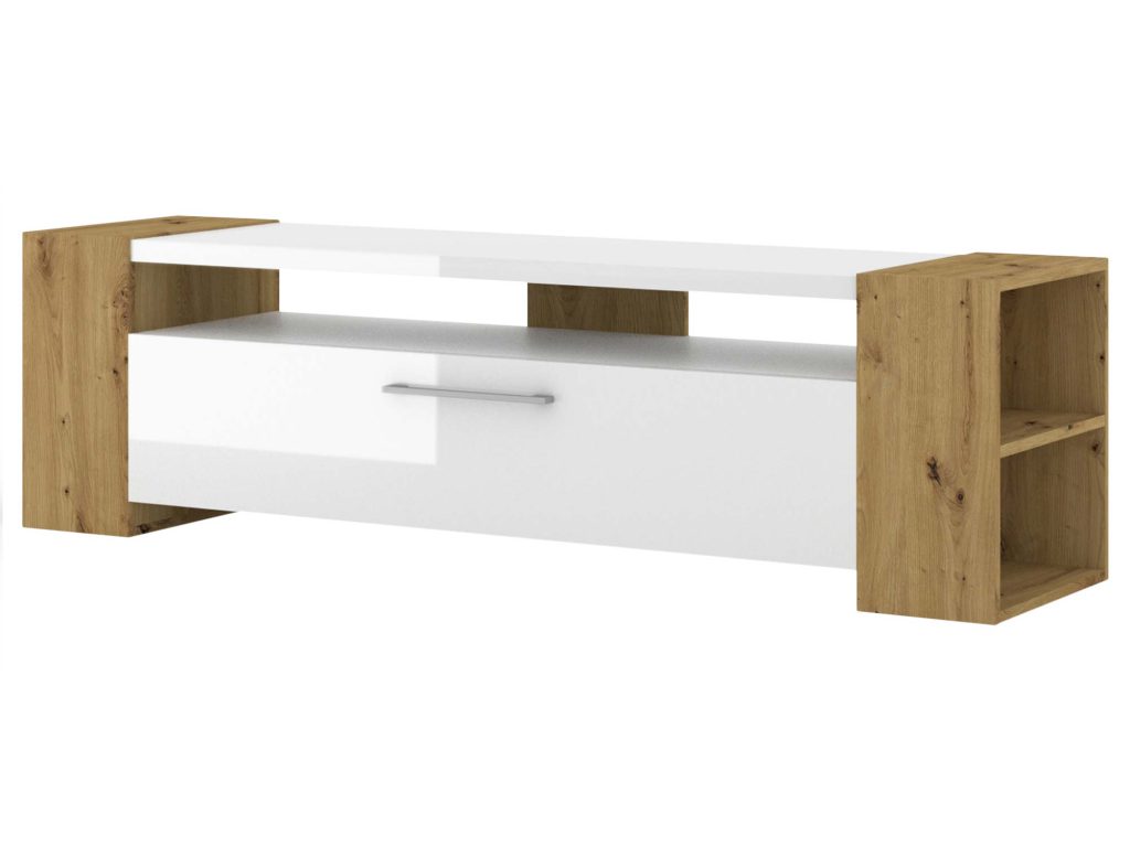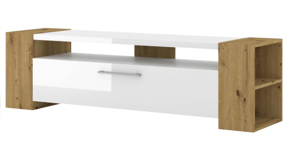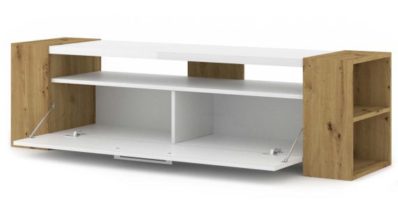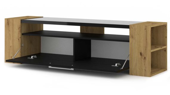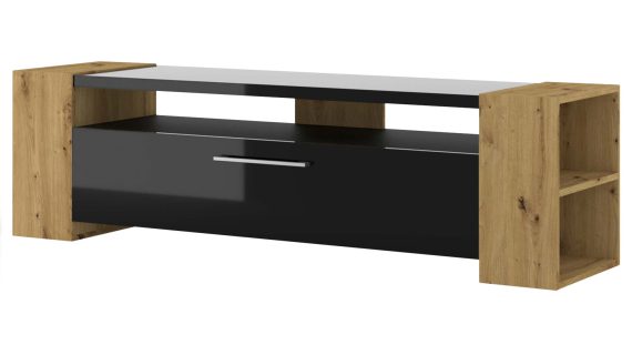 Szafka RTV DARLA to esencja przemyślanego designu. Jej prostokątna forma została wzbogacona o fronty w wysokim połysku, co nie tylko pięknie odbija światło, ale też nadaje całości elegancki i lekki charakter. Trzy warianty kolorystyczne pozwalają dopasować mebel do Twojego wnętrza: od nowoczesnego zestawienia czerni i bieli, po subtelny i naturalny odcień dąb artisan, który ociepli każde pomieszczenie.