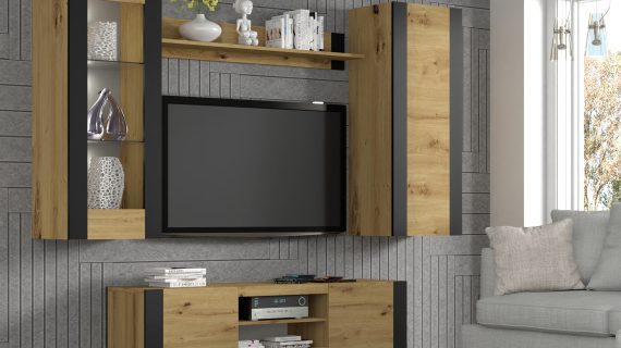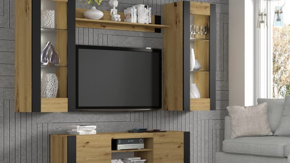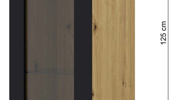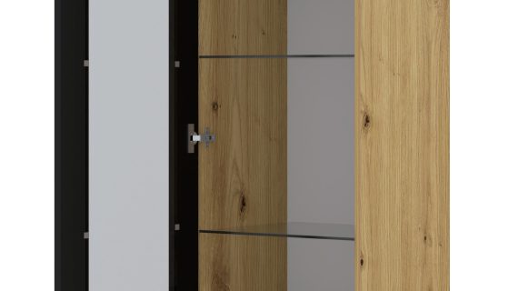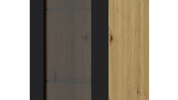 Kolorystyka opiera się na zbalansowanym połączeniu dębu artisan i głębokiej czerni. Drewno wnosi ciepło, a czerń nadaje głębi i kontrastu. Efekt? Nowoczesna witryna o charakterze, który współgra zarówno z betonem, cegłą, jak i pastelami. Idealna do salonu, jadalni lub biura.