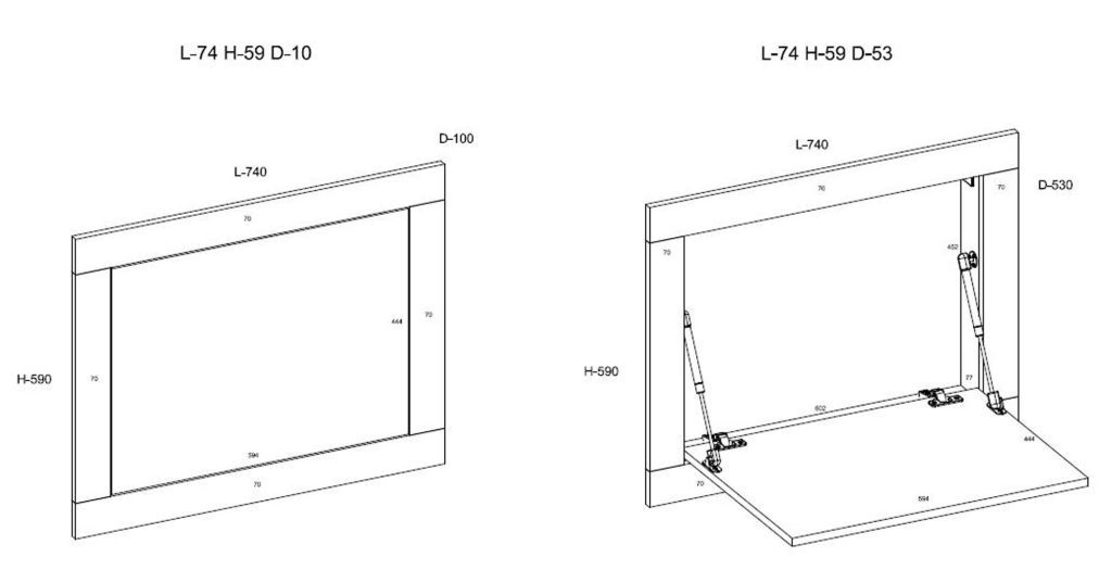 - Materiały wykonania: 16 mm płyta laminowana, płyta MDF, siłowniki gazowe teleskopowe ułatwiające otwieranie i zamykanie,
