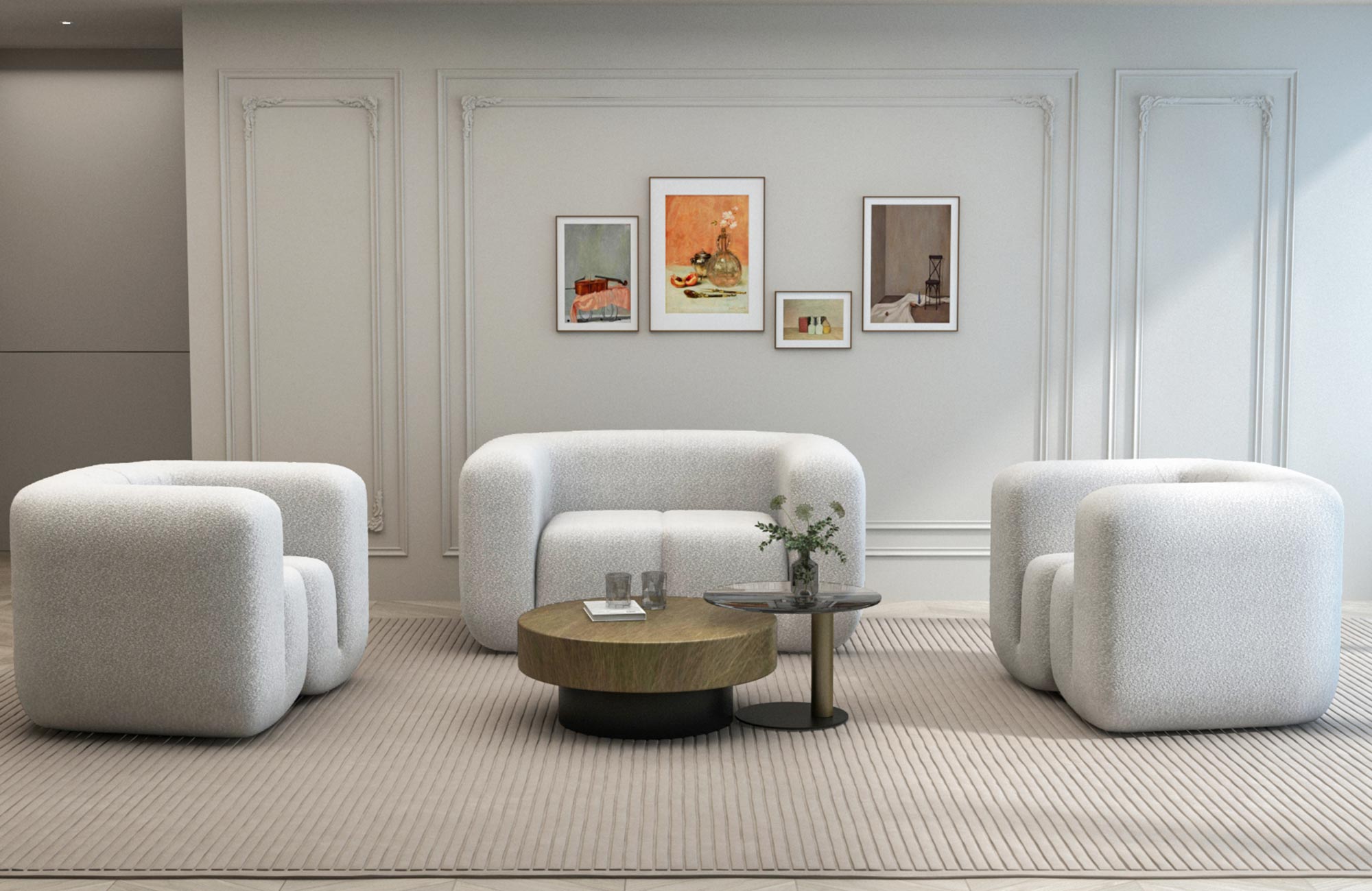 Ten nowoczesny fotel został zaprojektowany tak, aby przyciągać uwagę swoimi łagodnymi liniami i unikalnym oparciem w kształcie litery C. Tkanina szenilowa z asymetryczną strukturą i delikatnymi supełkami podkreśla wyjątkowy charakter mebla. Dodatkowo, jasnoszary odcień szenilu pasuje zarówno do nowoczesnych, jak i klasycznych aranżacji, nadając wnętrzom subtelny i elegancki wygląd.