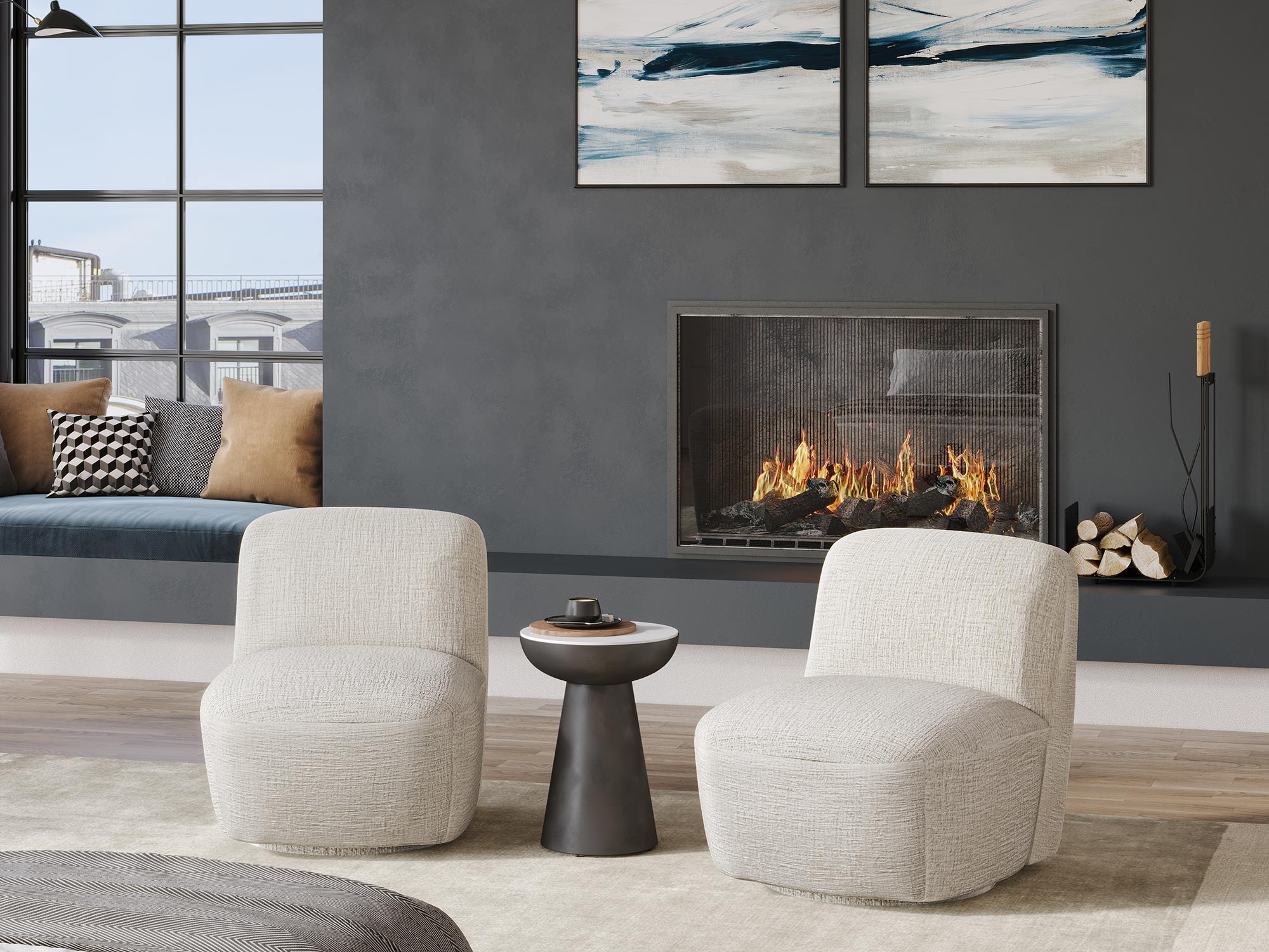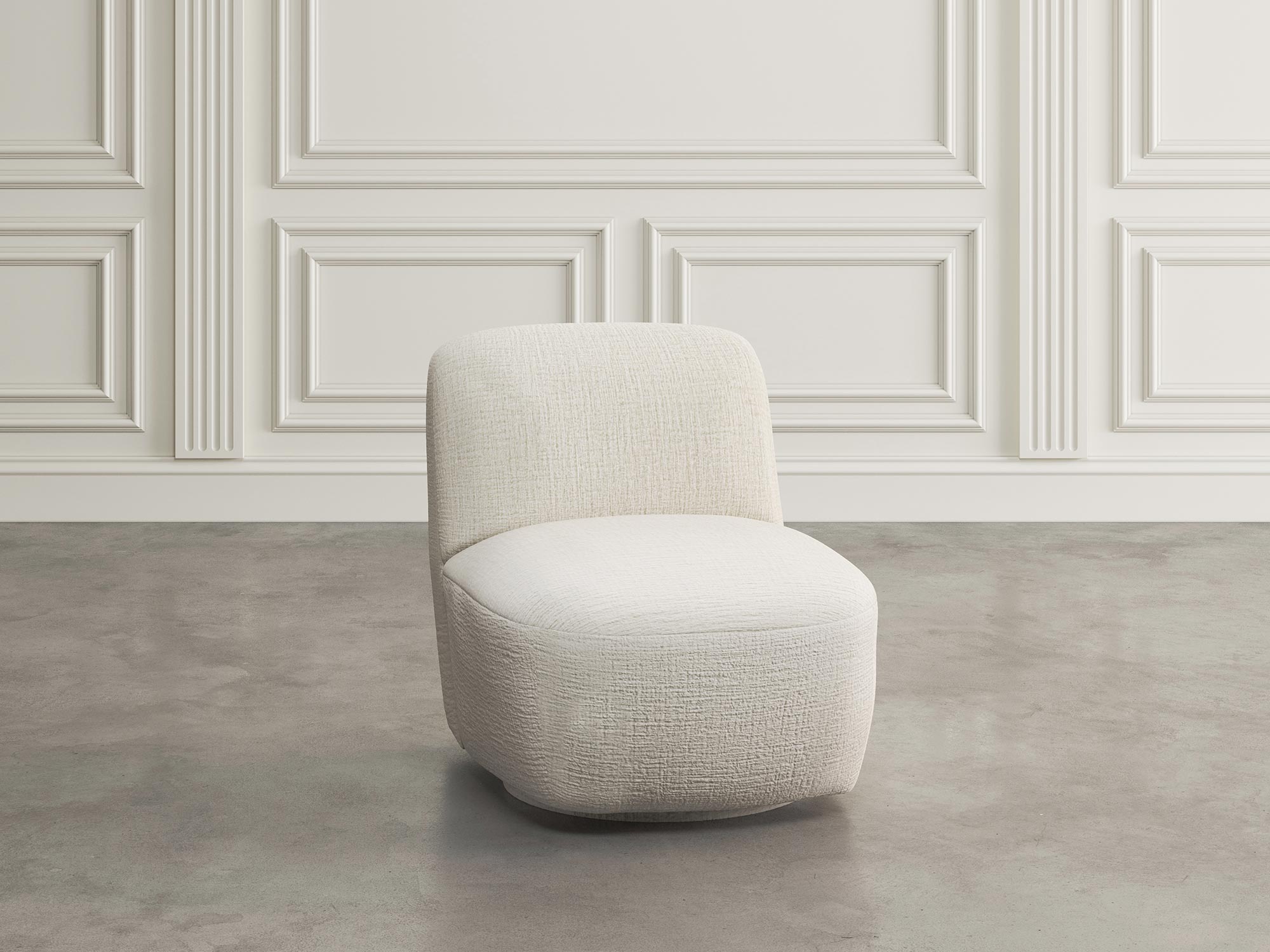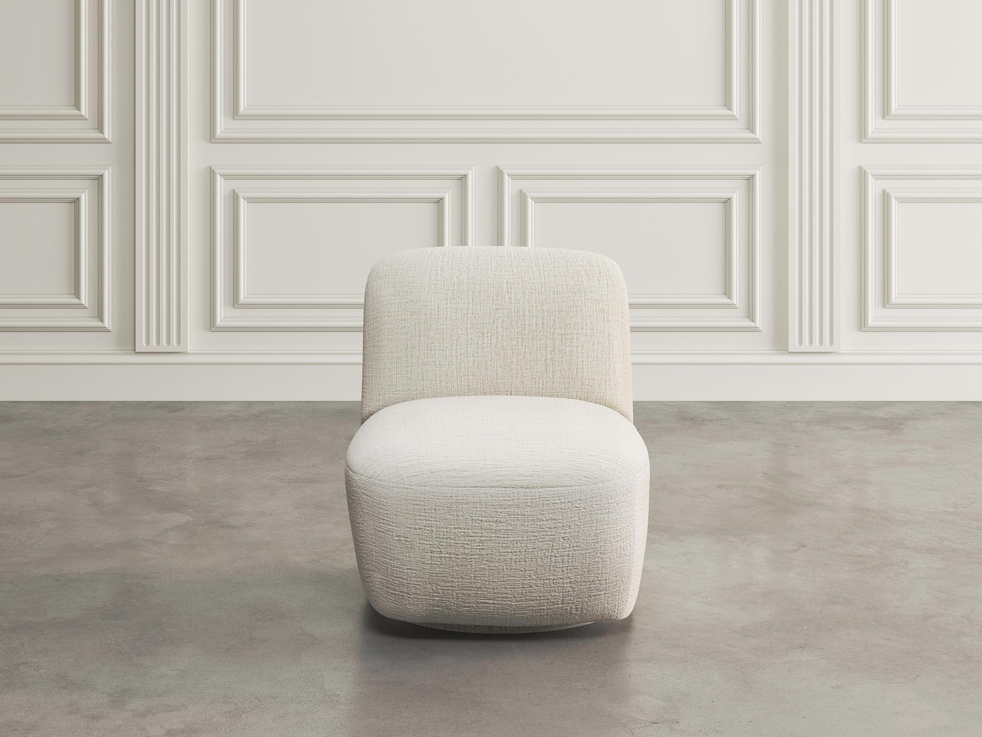 Wprowadź luksus i komfort do swojego salonu z eleganckim fotelem obrotowym w perłowej bieli. Jego subtelne obłe kształty i wysokiej jakości tapicerka szenilowa czynią go idealnym wyborem dla miłośników współczesnego designu.