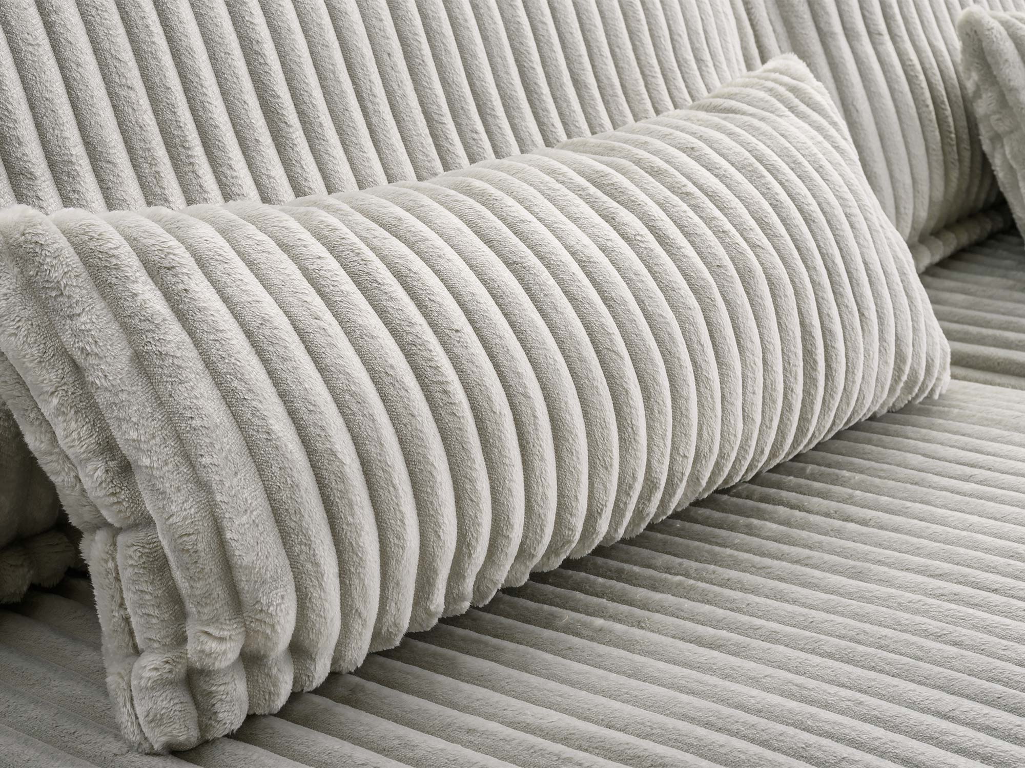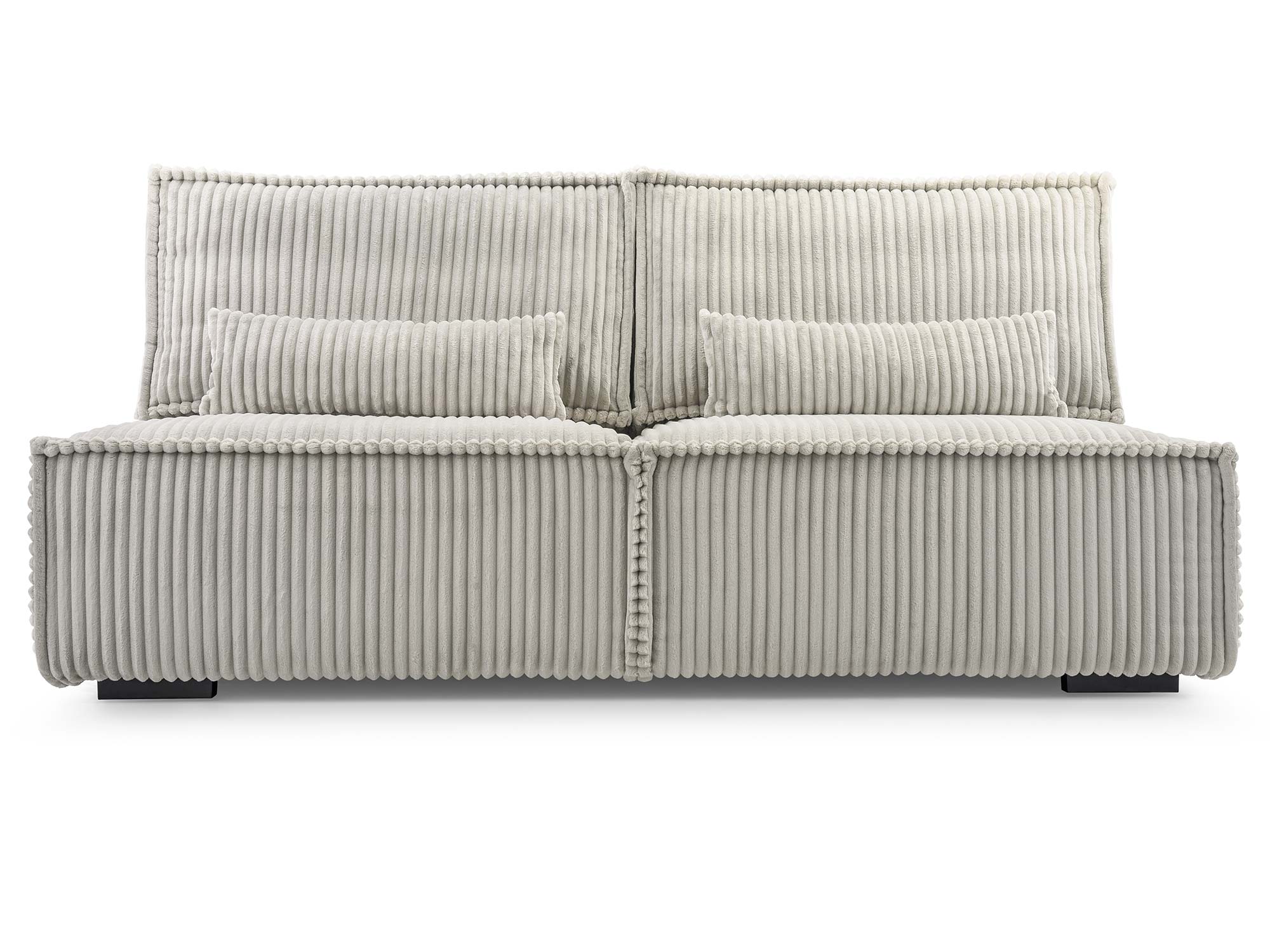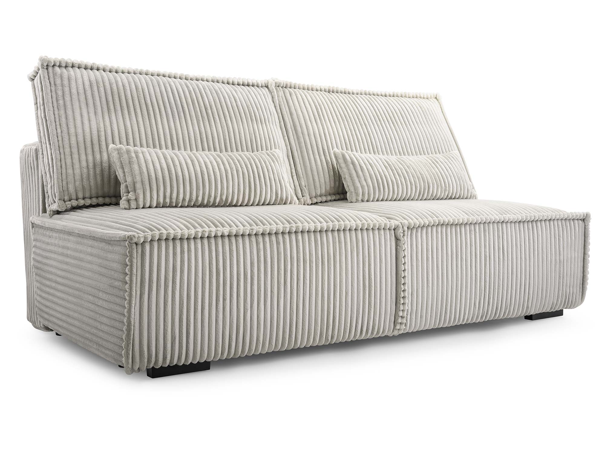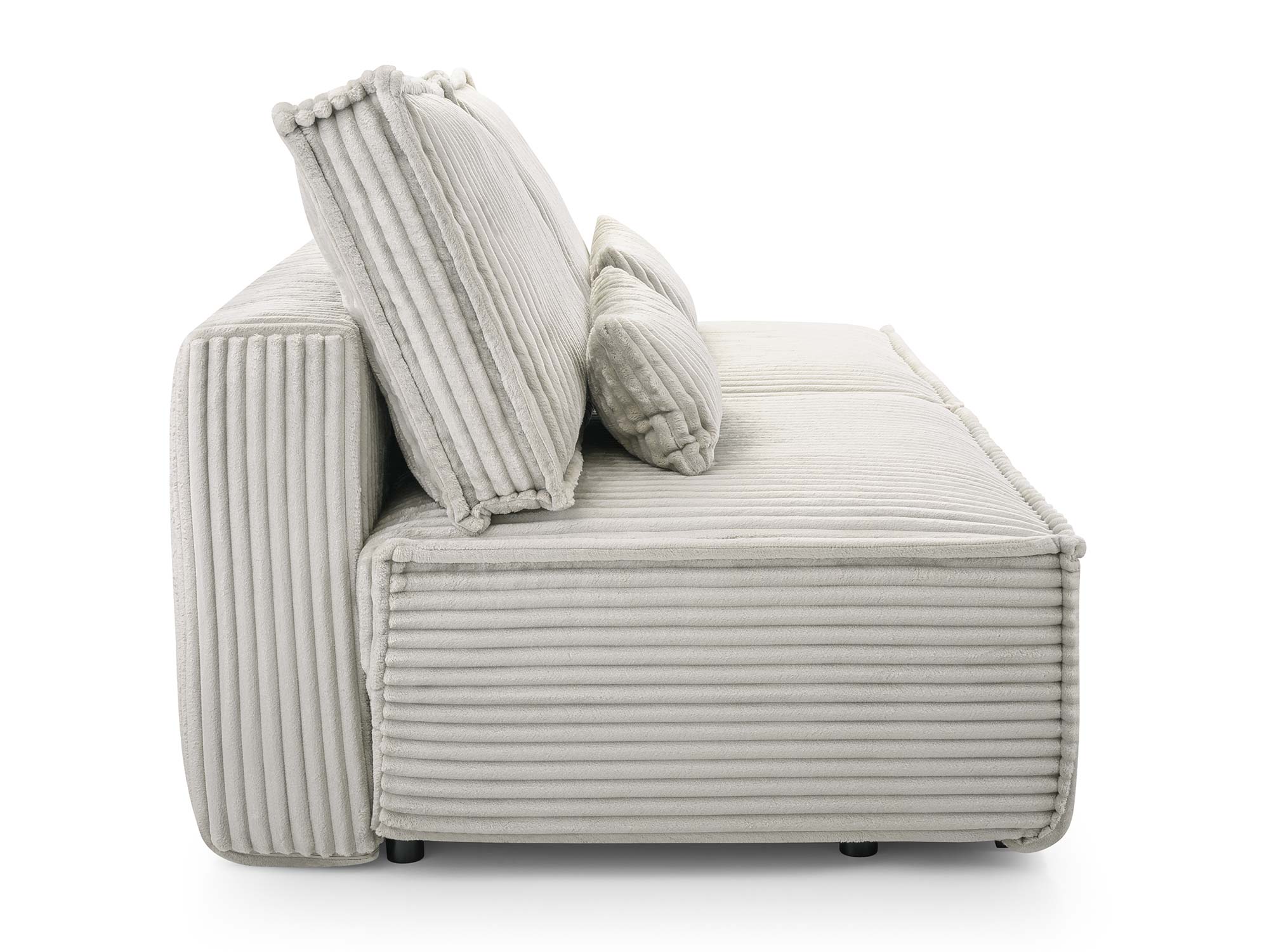 Do zestawu dołączone są 2 poduszki oparciowe oraz 2 mniejsze poduszki dekoracyjne, które zwiększają wygodę użytkowania i dodają sofie przytulnego charakteru. Czarne plastikowe nóżki mocowane na śrubach (wysokość 4,5 cm) podkreślają nowoczesny design, a jednocześnie zapewniają stabilne ustawienie mebla.