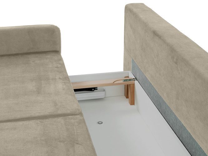 - Pojemnik na pościel – praktyczny schowek pod siedziskiem umożliwia przechowywanie pościeli lub innych rzeczy, pomagając utrzymać porządek.