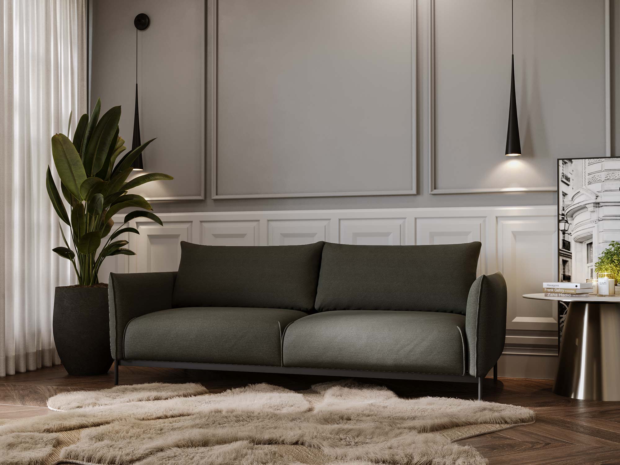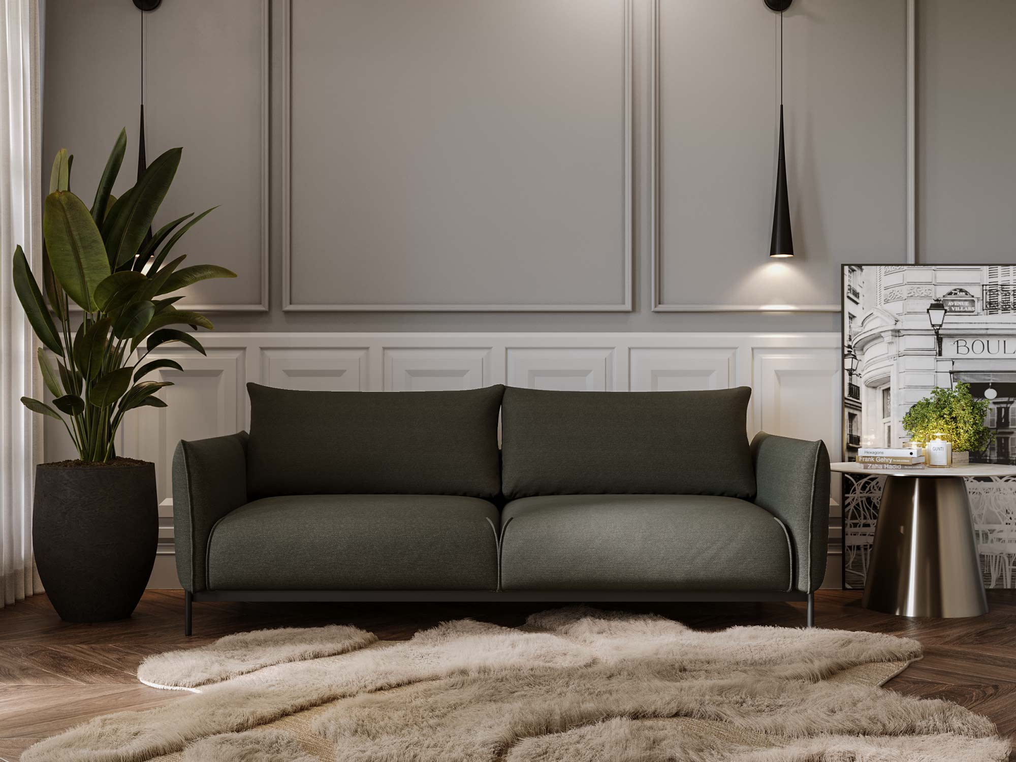 Nowoczesna sofa w kolorze khaki w eleganckim salonie z rośliną