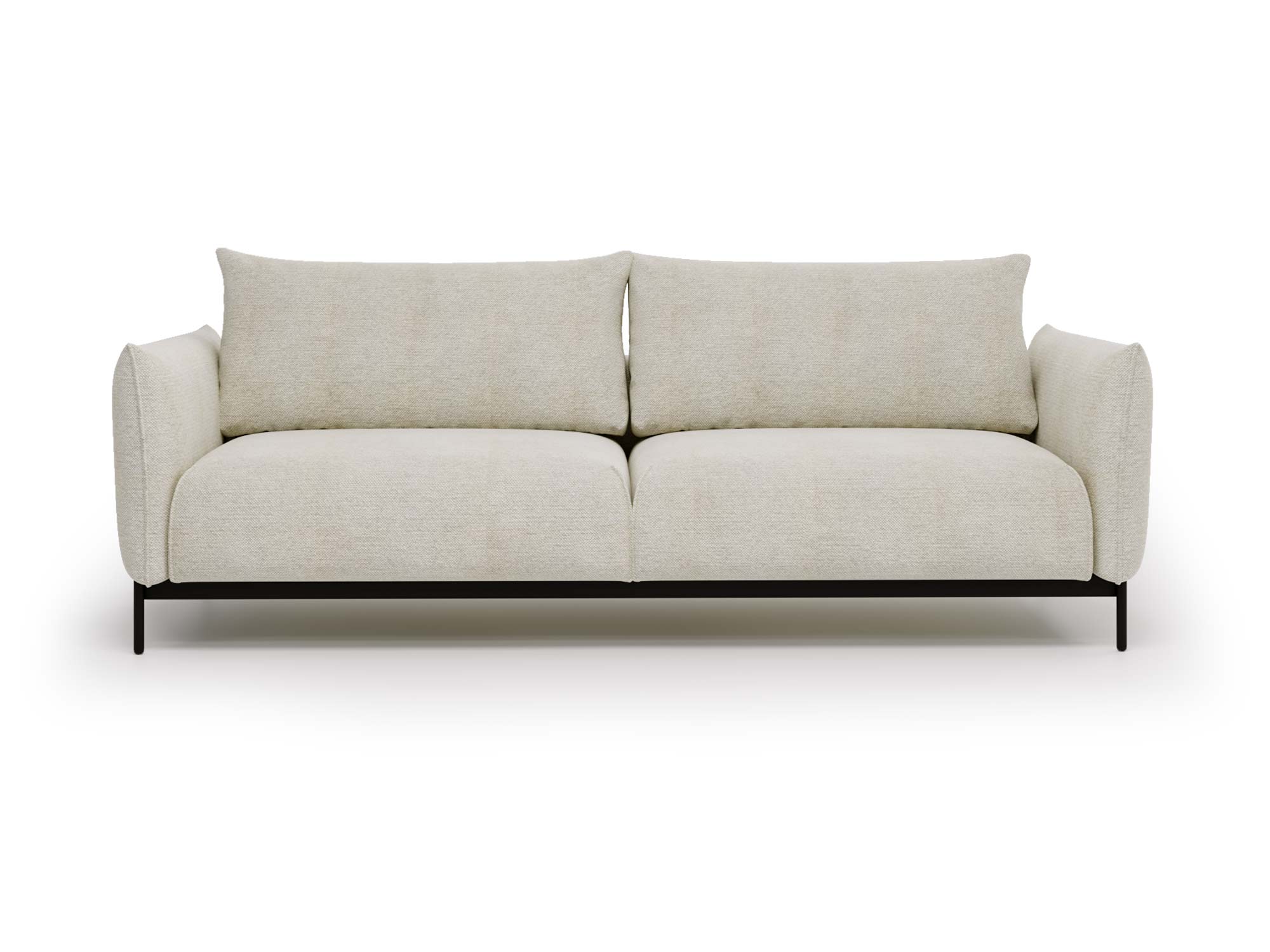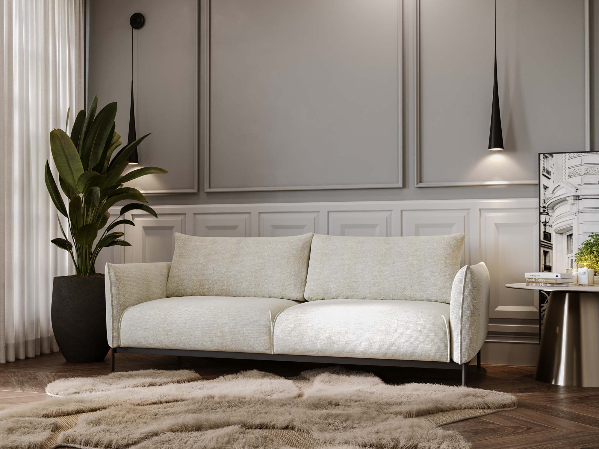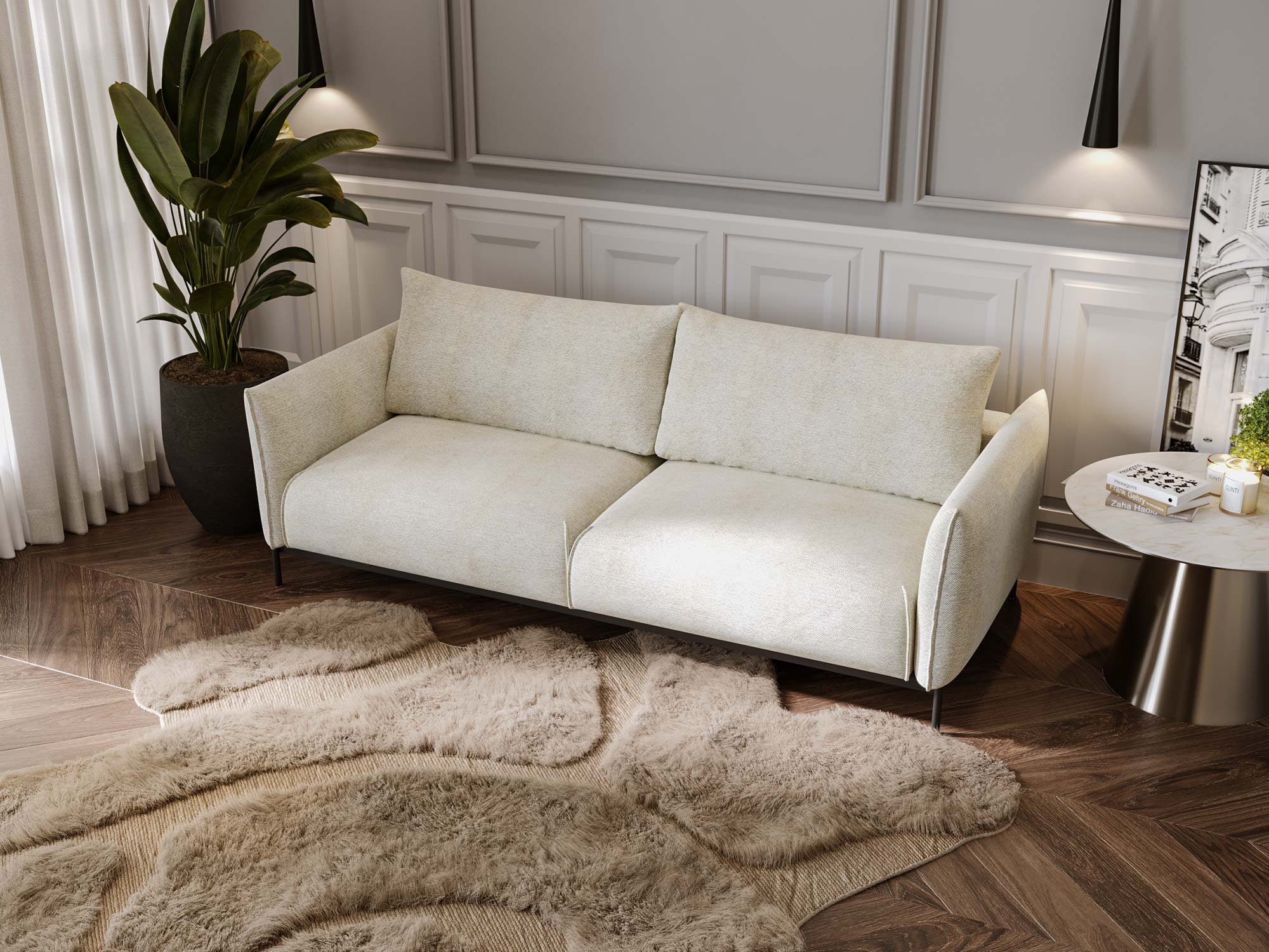 Beżowa sofa o lekkiej konstrukcji i czarnych nóżkach