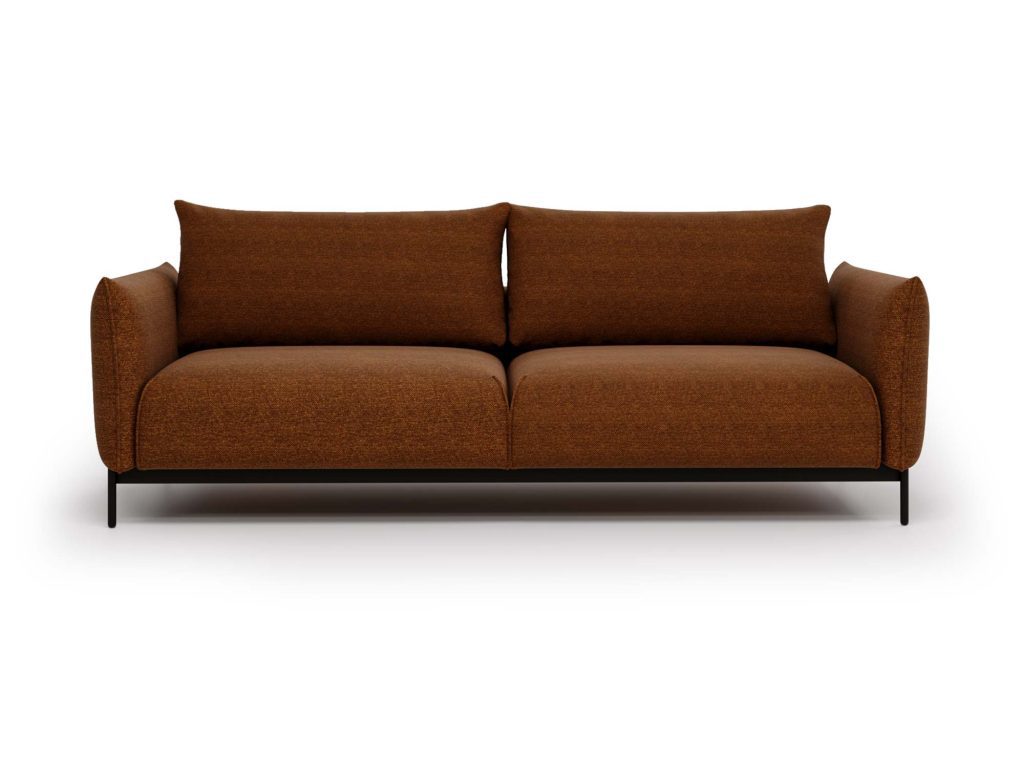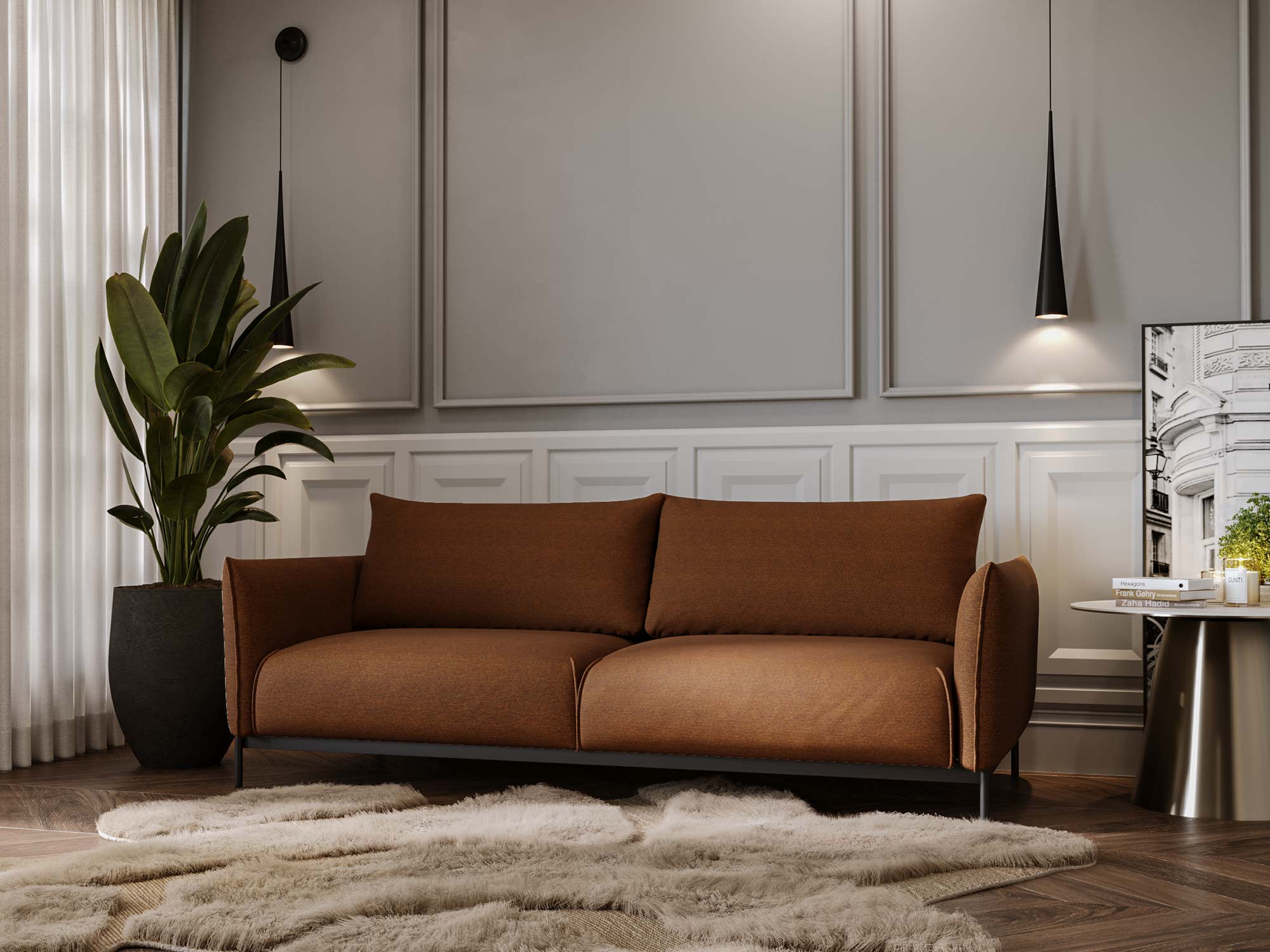 Sofa ceglana z dwiema dużymi poduszkami i prostym designem