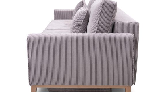 Przede wszystkim sofa glamour rozkładana PELATAS to nowoczesny model sofy, wyróżniający się ciekawymi detalami. Sofa posiada solidny i trwały stelaż wykonany z drewna oraz drewniane nóżki, które nadają całości konstrukcji lekkiego i świeżego charakteru. Ponadto mebel ten doskonale odnajdzie się szczególnie we wnętrzach urządzonych w skandynawskim stylu. Co więcej interesujący akcent stanowią ozdobne lamówki, którymi wykończone zostały obrzeża narożnika. Co najważniejsze dodają one prezentowanej sofie oryginalnego i niepowtarzalnego charakteru. Nowoczesna forma tego modelu wzbogacona została dodatkowo o praktyczne rozwiązania konstrukcyjne oraz komponenty wysokiej jakości. Co więcej jest to mebel, który z całą pewnością przypadnie do gustu każdemu użytkownikowi ceniącemu sobie wysoką jakość i niezwykłą wygodę posiadanych mebli.