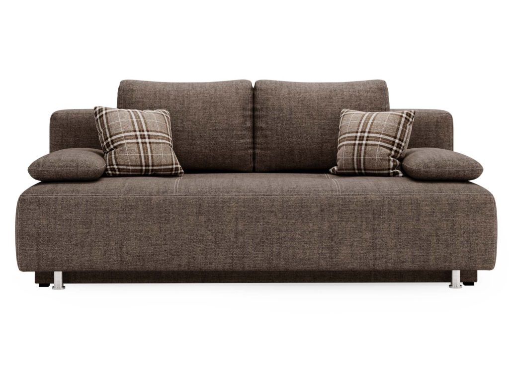 Sofa brązowa z wysokim siedziskiem i dekoracyjnymi dodatkami