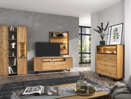 Proste i eleganckie meble do salonu Roma wykonane z najwyższej jakości litego drewna dębowego z elementami fornirowanymi świetnie dostosują się do każdej aranżacji niejednym pokoju dziennym czy salonie. Ponadto stabilna forma oraz gustowne i awangardowe wykończenie sprawią, że stylowe meble do salonu wspaniale ozdobi każde wnętrze. W skład kompletu wchodzą witryna pokojowa, RTV z drewna, drewniana półka wisząca, komoda dwudrzwiowa.