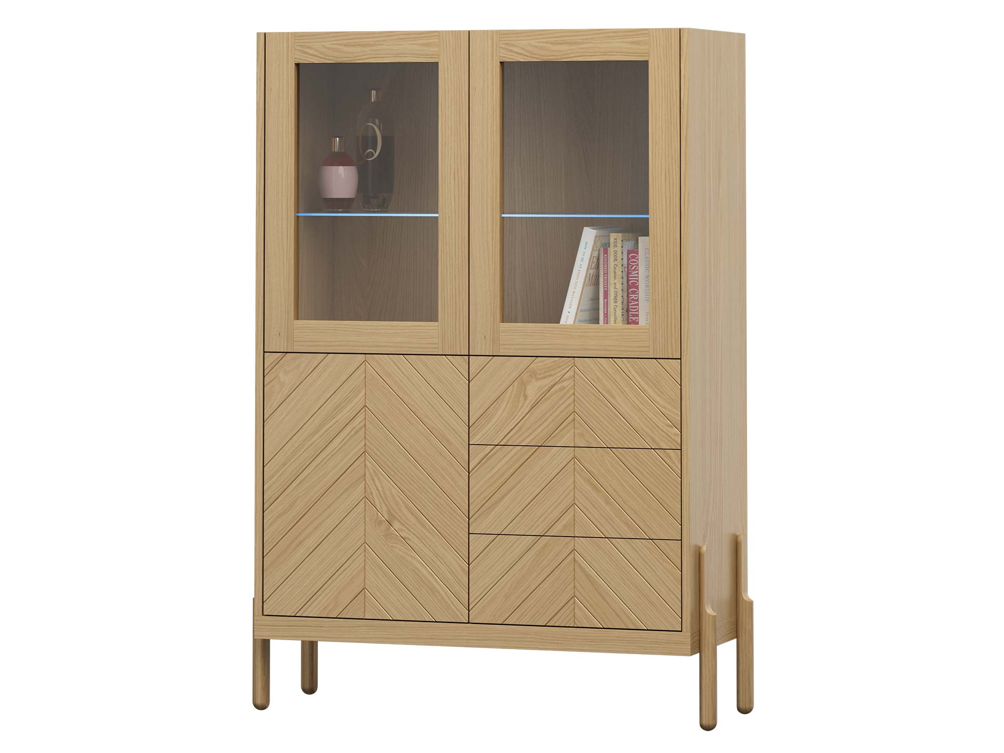Witryna Enza Saviero 3D3S to mebel, który od pierwszego spojrzenia zachwyca elegancją i dopracowanymi detalami. Fronty wykończone w charakterystycznym wzorze jodełki stanowią subtelny akcent dekoracyjny, który podkreśla wyjątkowy charakter kolekcji. Całość została zaprojektowana w duchu nowoczesnej klasyki – stylu, który łączy tradycyjne piękno z minimalistyczną prostotą.