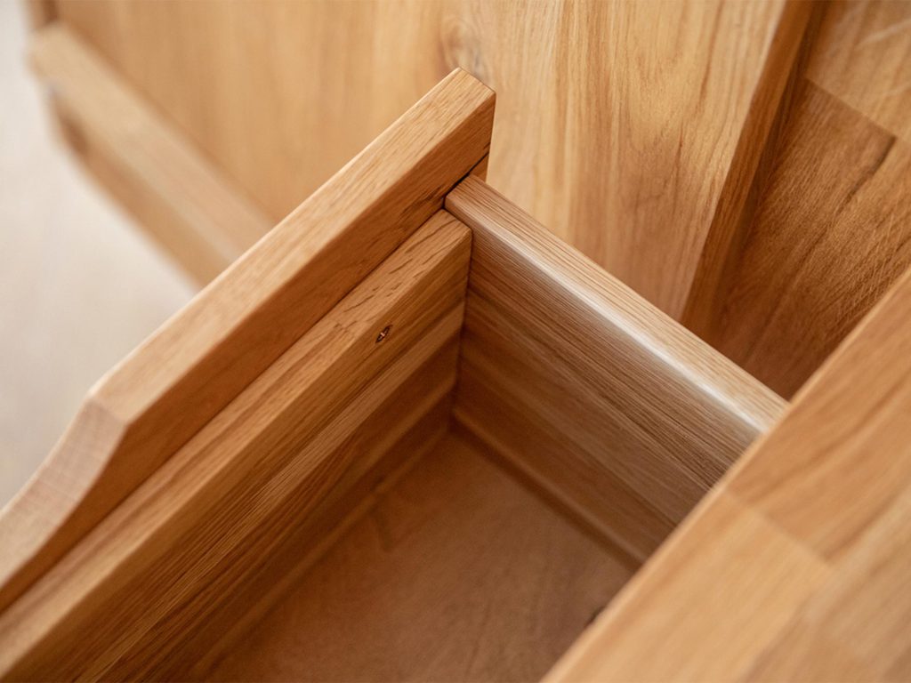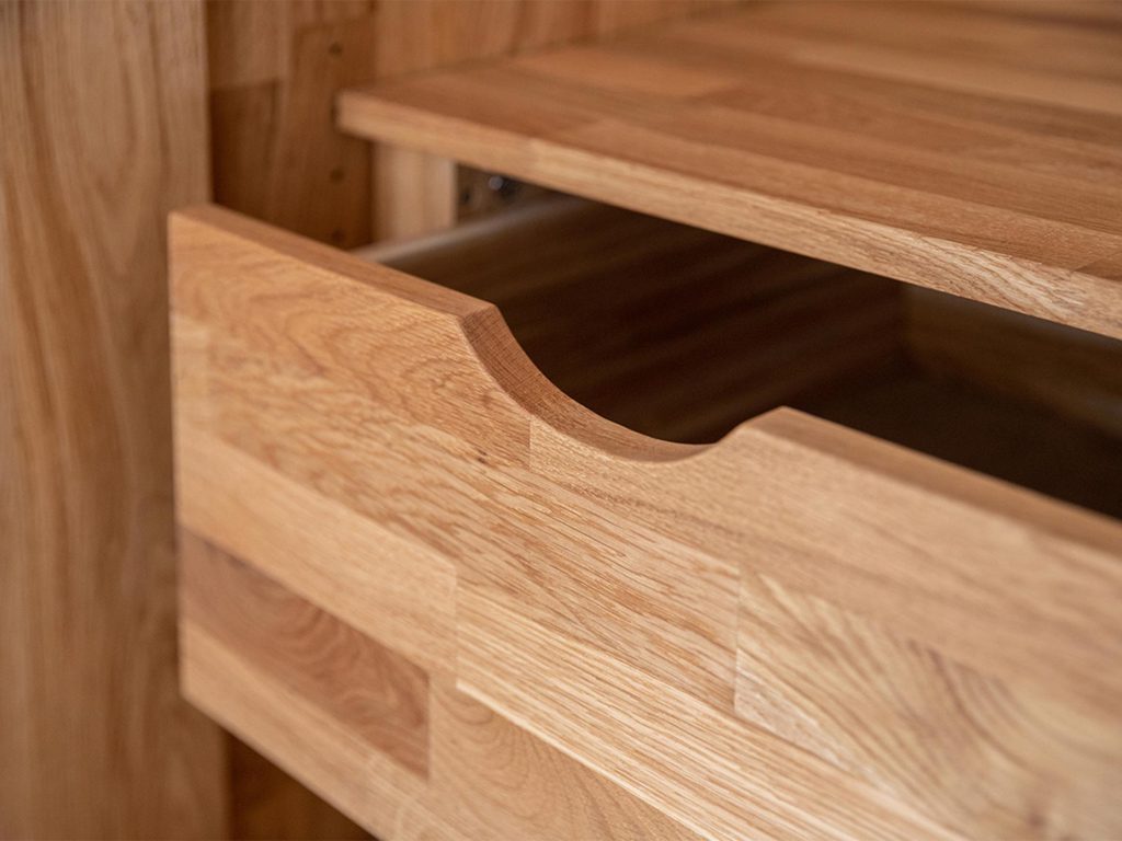 Podstawa jakości zaczyna się od surowca. Fronty i korpus wykonano z naturalnego drewna dębowego, które słynie z twardości i odporności na codzienne użytkowanie. Powierzchnię wykończono ekologicznym olejem – to bezpieczna ochrona, dzięki której drewno zachowuje swój naturalny wygląd, a drobne ślady użytkowania można łatwo odświeżyć.