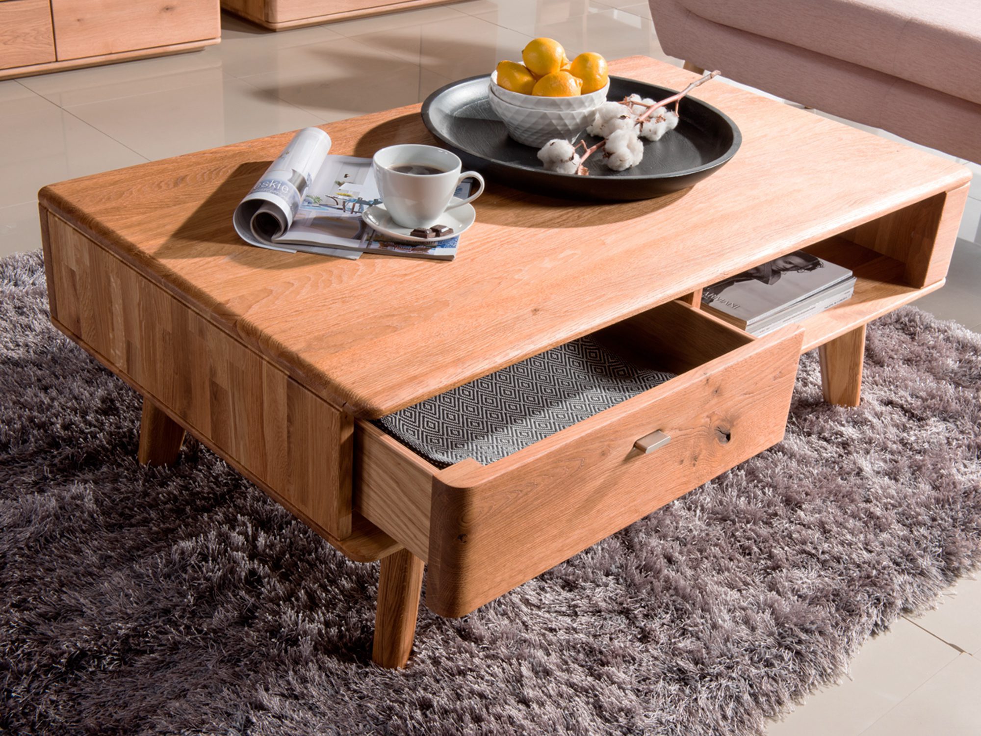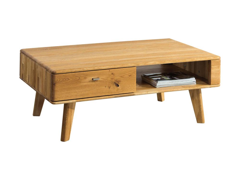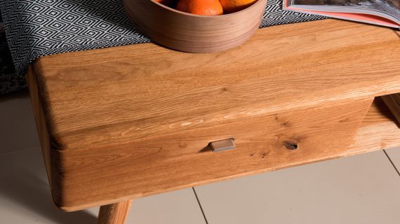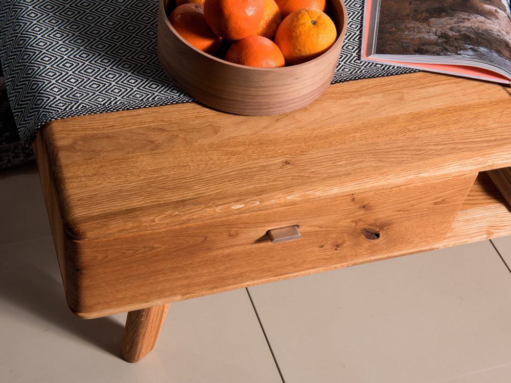 Ława drewniana nowoczesna składa się z pojemnej szuflady i dużej wnęki, które świetnie nadają się do chowania czasopism książek, a także pilota lub niewielkiego sprzętu RTV. Z pewnością na powierzchni blatu śmiało znajdzie się miejsce dla filiżanek z kawą i kubków z gorącą herbatą jak również dla talerzyka z ciastem. Stolik cechuje nowoczesny styl oraz eleganckie wykończenie. Do jego wytworzenia wykorzystano materiałów wysokiej jakości, drewniana ława z szufladą składa się z litego drewna dębowego, dzięki czemu idealnie wpasuje się w każde wnętrze, a przez swoją trwałość z pewnością posłuży przez wiele lat.