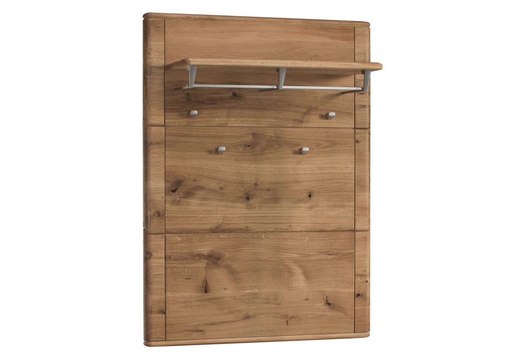 Prosty i elegancki panel wykonany z najwyższej jakości litego drewna dębowego wspaniale wpasuje się w stylizację panującą w każdym wnętrzu. Również stateczna konstrukcja oraz nowomodne, stylowe szlifowanie sprawią, że drewniany wieszak do przedpokoju wspaniale spełni swoje zadanie. W dodatku mebel posiada praktyczną półkę, na której znajdzie się miejsce dla czapek czy szalików, a nawet rękawiczek. Ponadto na funkcjonalnych haczykach z łatwością można powiesić kurtki i płaszcze. Oprócz tego solidny reling bez wątpienia utrzyma parasol czy wieszak z futrem.
