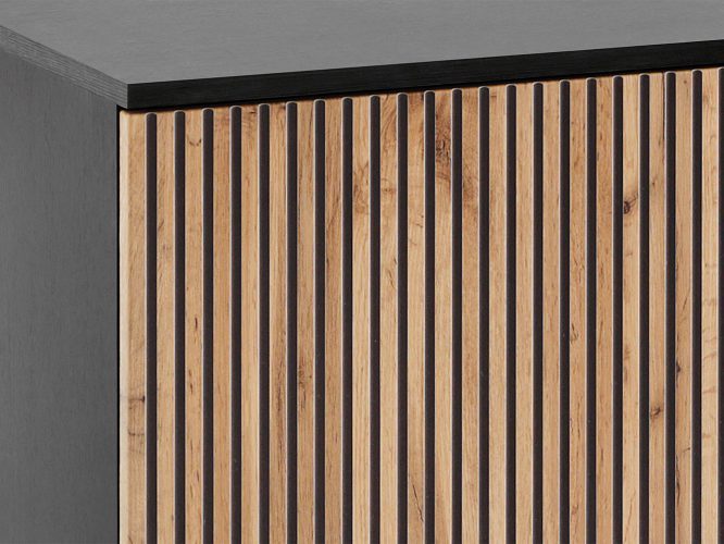 • Wyjątkowy design: Frezowane fronty w kolorze dąb wotan harmonijnie współgrają z głęboką czernią korpusu, tworząc nowoczesny, elegancki kontrast, który dodaje wnętrzu wyrafinowania.