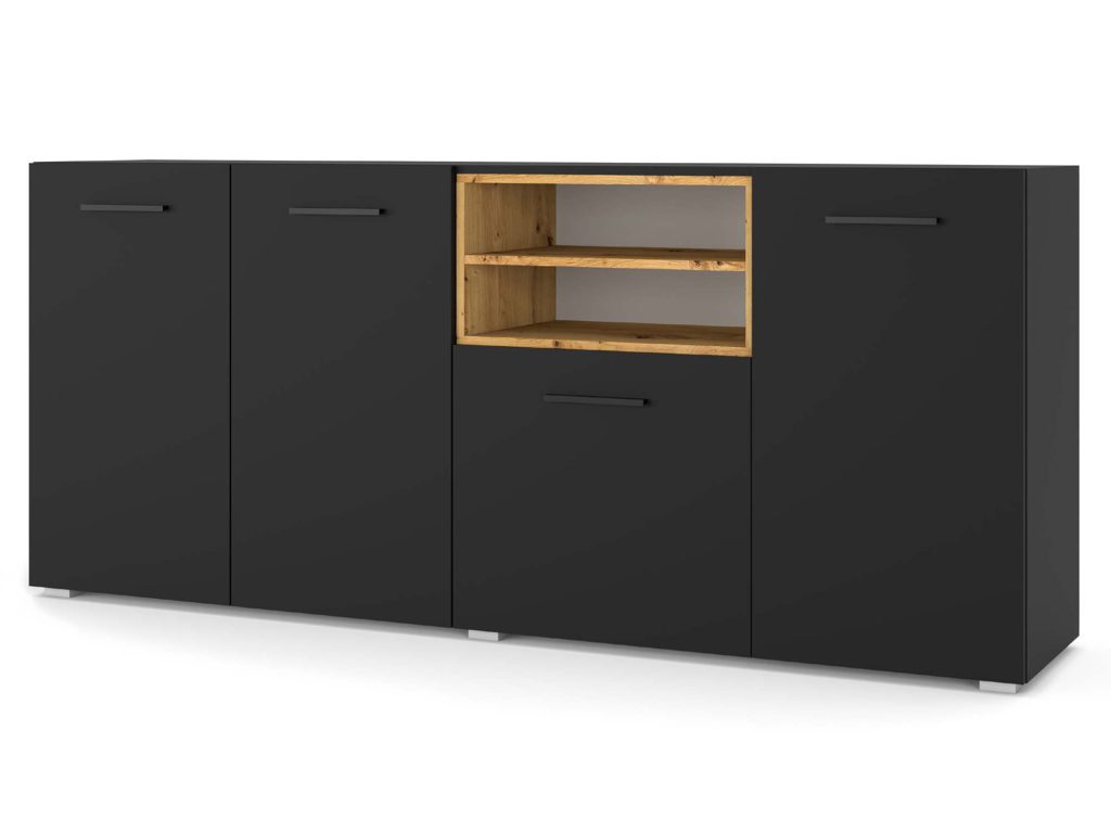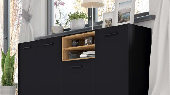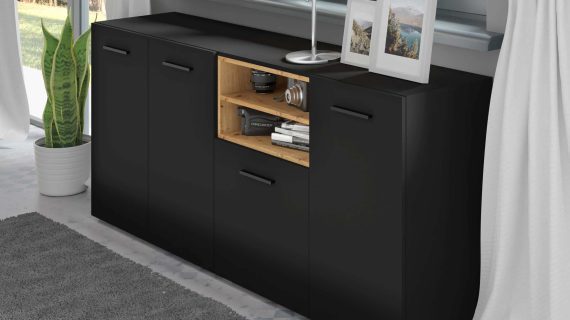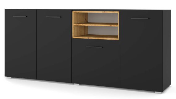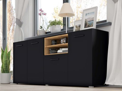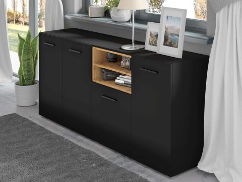 Wyraziste zestawienie matowej czerni z dekoracyjnym dekorem dąb artisan wprowadza do pomieszczenia przytulną, a zarazem designerską atmosferę. Czarne, dyskretne uchwyty dodają komodzie charakteru, jednocześnie nie odciągając uwagi od harmonijnej formy bryły.