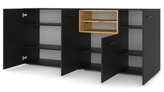 Zobacz, jak zmienia się charakter wnętrza, kiedy do salonu, jadalni lub sypialni trafia mebel, który łączy w sobie piękno i funkcjonalność. Duża komoda NIMET o szerokości 200 cm to propozycja, która oczaruje Cię już od pierwszego spojrzenia. Jej minimalistyczny design i kontrastowe zestawienie głębokiej czerni z naturalnym dębem artisan sprawiają, że staje się sercem każdej aranżacji. A dzięki ogromnej pojemności – sprawdzi się nie tylko jako ozdoba, ale także jako praktyczny mebel do przechowywania.