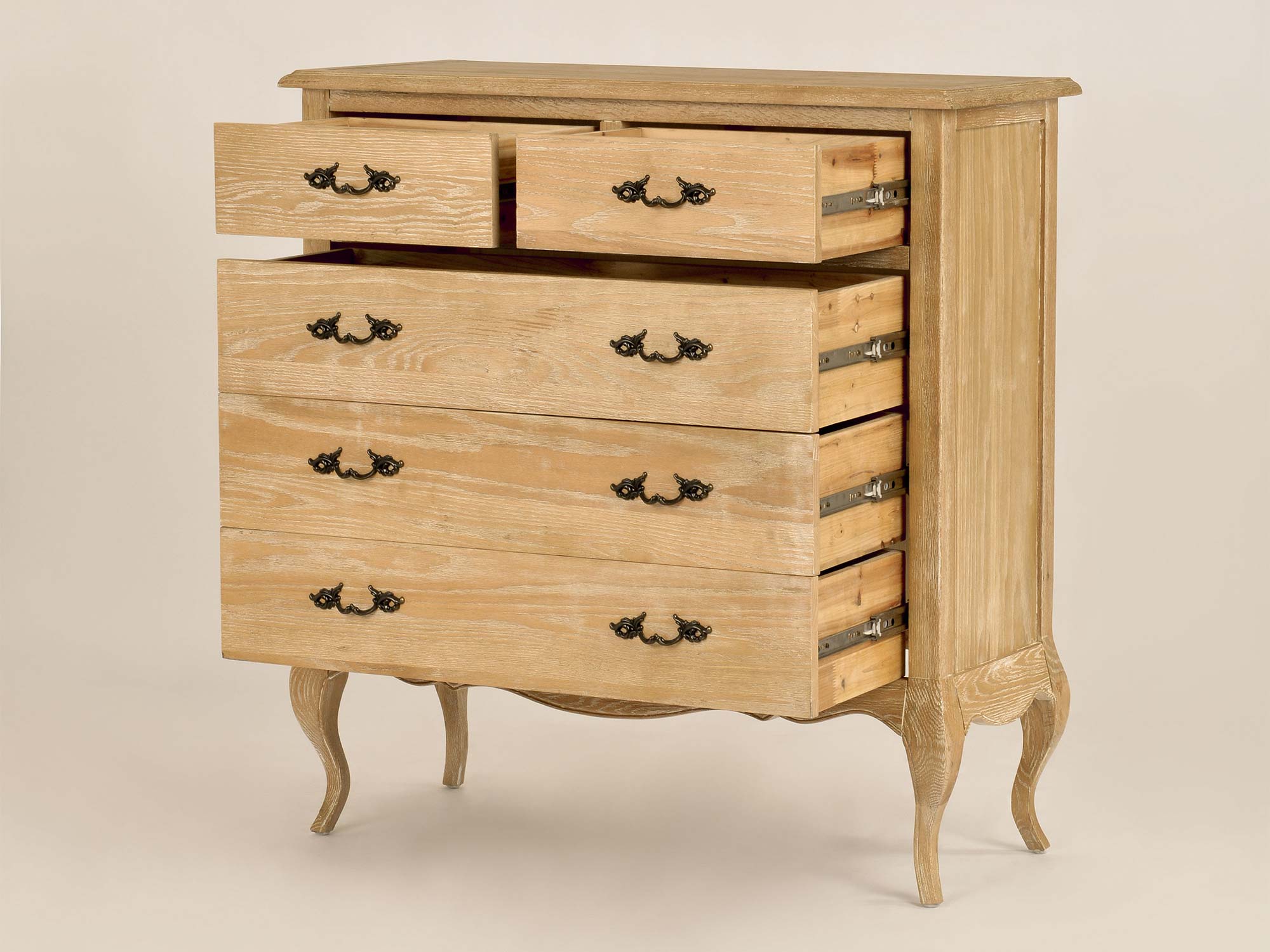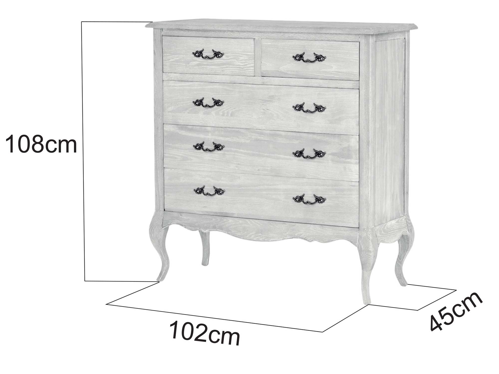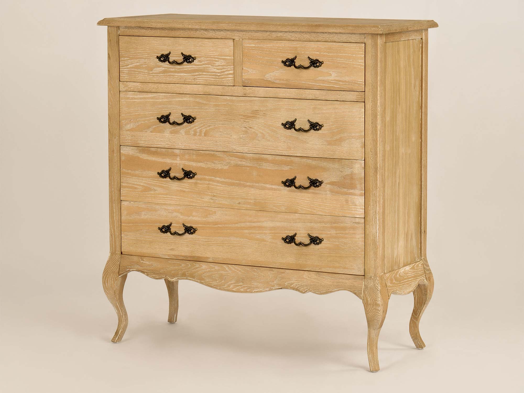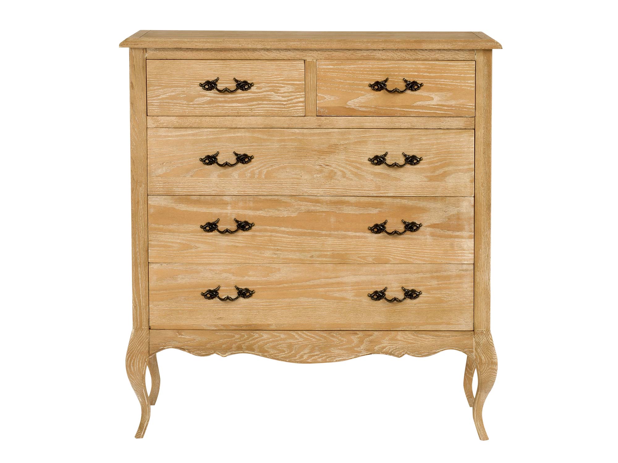 Stylowa komoda drewniana na giętych nogach, zaprojektowana w duchu francuskiego szyku. Naturalne, bielone drewno z widoczną strukturą łączy się z ozdobnymi, metalowymi uchwytami w kolorze ciemnego mosiądzu. Szczotkowana powierzchnia i delikatne przetarcia shabby chic nadają meblowi wyjątkowego uroku, który idealnie wpasuje się w każde wnętrze.