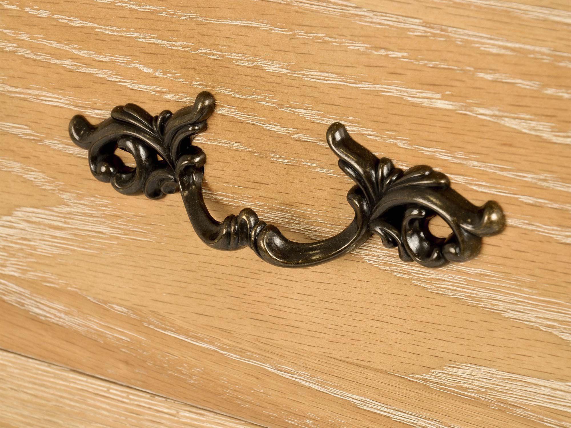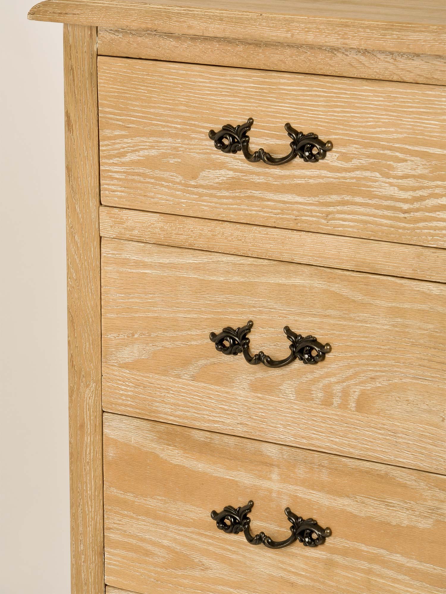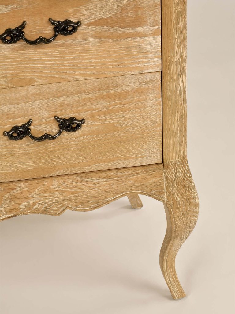 Komoda Venezia Oak została zaprojektowana z myślą o miłośnikach klasycznego stylu francuskiego. Jej gięte nogi, precyzyjne frezowania oraz ozdobne uchwyty to elementy, które podkreślają jej elegancki charakter. Szczotkowana powierzchnia i delikatne przetarcia dodają subtelnego wdzięku vintage, czyniąc tę komodę nie tylko funkcjonalnym meblem, ale także piękną ozdobą wnętrza.
