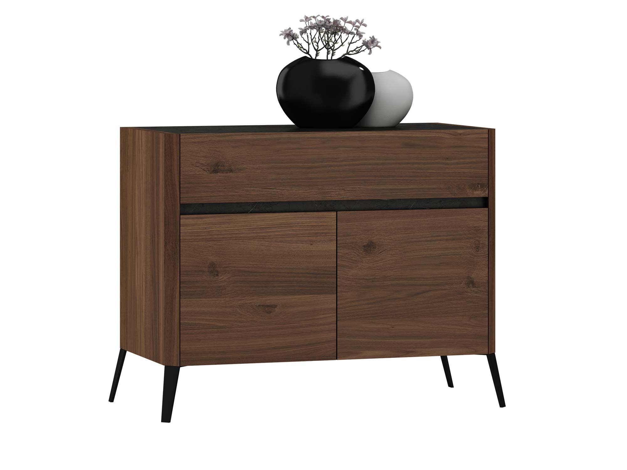 Korpus w kolorze orzecha baltimore nadaje komodzie ciepły i szlachetny charakter, a blat wykonany z szarego kamienia podkreśla nowoczesny wymiar całej kolekcji. Pojemne wnętrze kryjące się za dwoma drzwiczkami oraz dodatkowa szuflada pozwalają na wygodne przechowywanie zarówno dokumentów, jak i akcesoriów codziennego użytku.