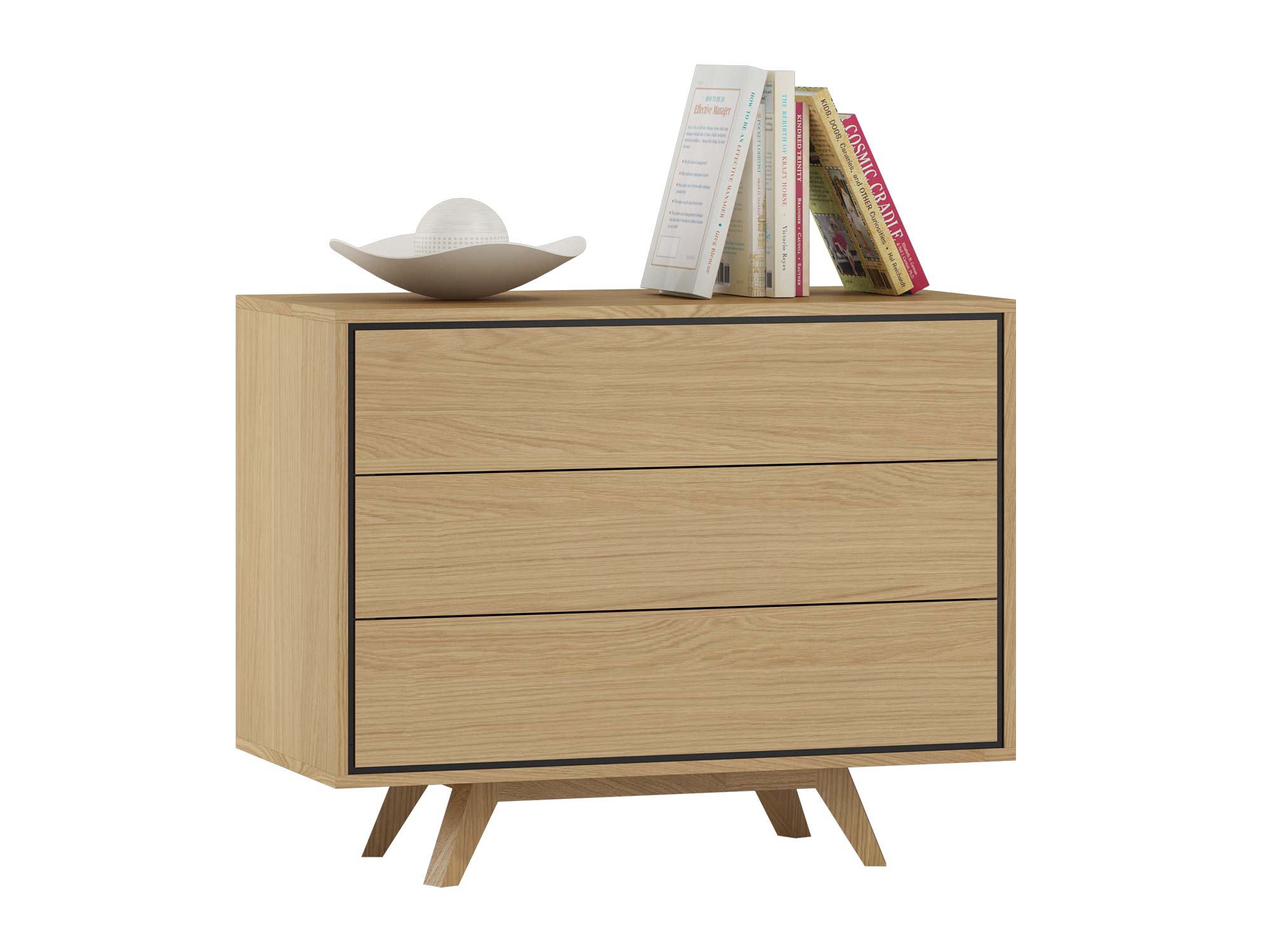 Stabilna podstawa z litego drewna dębowego nadaje meblowi lekkości i subtelnej elegancji. Ten detal sprawia, że komoda wydaje się unosić nad podłogą, co dodaje całej bryle nowoczesnego charakteru. Kompaktowe wymiary (szerokość 100 cm, wysokość 80 cm, głębokość 50 cm) sprawiają, że mebel doskonale wpisze się zarówno w przestronne, jak i mniejsze wnętrza.