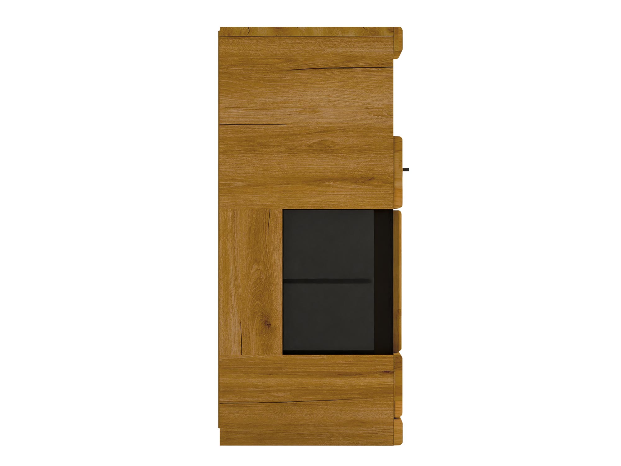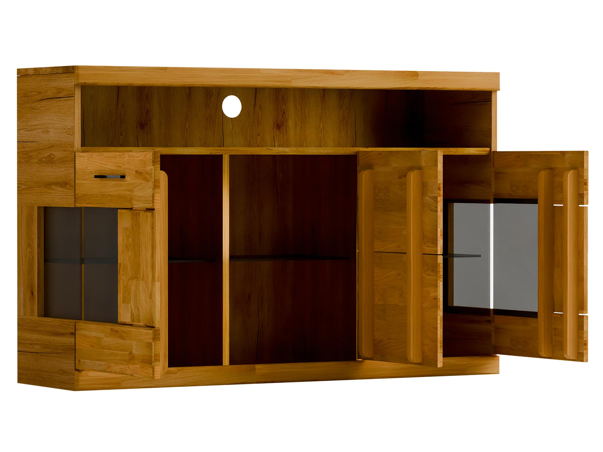 Komoda dębowa 125 cm – otwarta półka RTV, szkło hartowane i cichy domyk