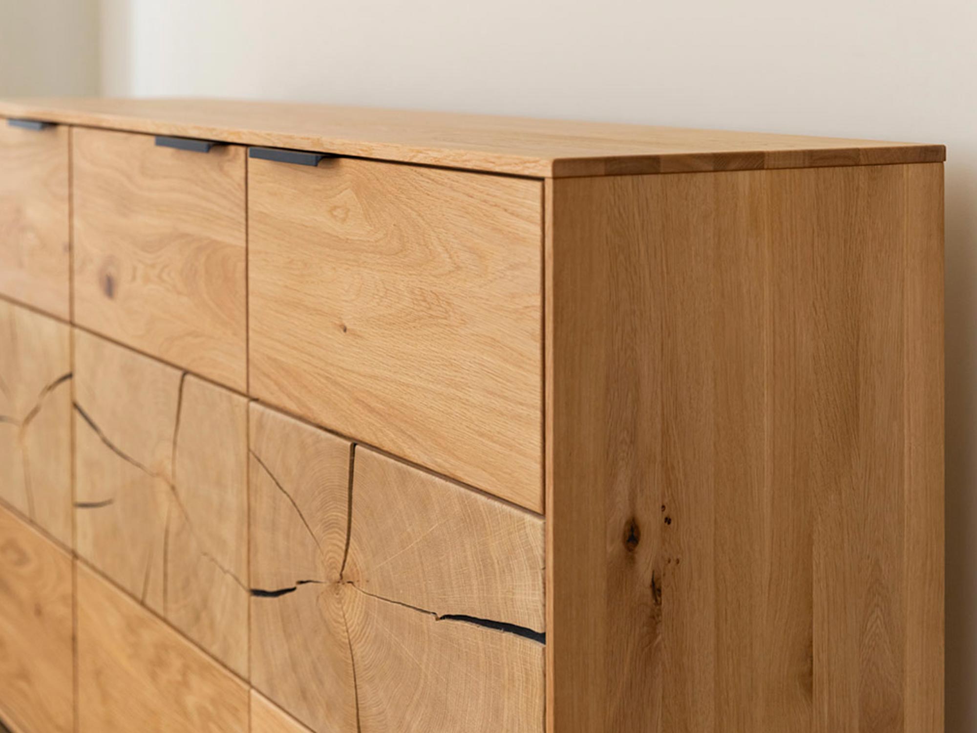 Komoda Dębowa Valora Modernistyczna to nie tylko piękno naturalnego drewna, ale przede wszystkim mistrzowska precyzja wykonania. Każdy element komody, od płatów drewna zdobiących front, po starannie oszlifowane krawędzie, świadczy o wysokiej jakości i dbałości o detale. Naturalne słoje dębu, widoczne na powierzchni, podkreślają elegancję tego mebla, a dzięki olejowanemu wykończeniu drewno zachowuje swoje naturalne właściwości, oferując jednocześnie trwałą ochronę przed codziennym użytkowaniem.