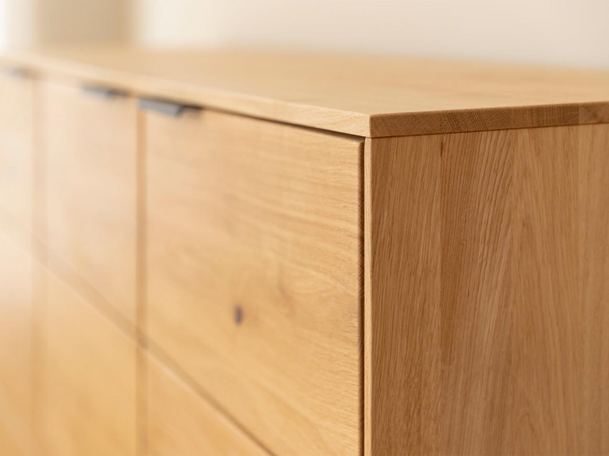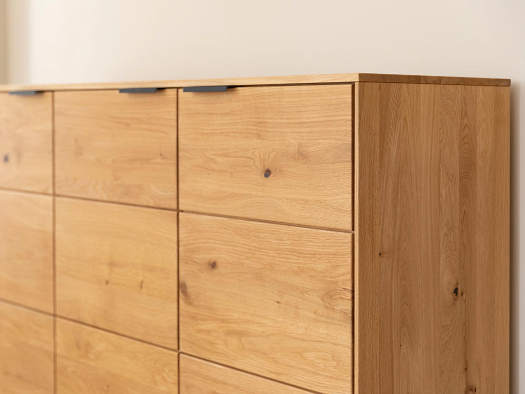 Komoda Valora wyróżnia się nie tylko estetyką, ale także niezrównaną trwałością, którą zawdzięcza wykorzystaniu naturalnego drewna dębowego. Dąb to materiał ceniony za swoją wytrzymałość i odporność na uszkodzenia, co gwarantuje, że nawet intensywne codzienne użytkowanie nie odbije się na wyglądzie mebla. Każda powierzchnia komody została starannie wyszlifowana i wykończona olejowaniem, co nie tylko podkreśla naturalne piękno drewna, ale także chroni je przed wilgocią oraz zarysowaniami.