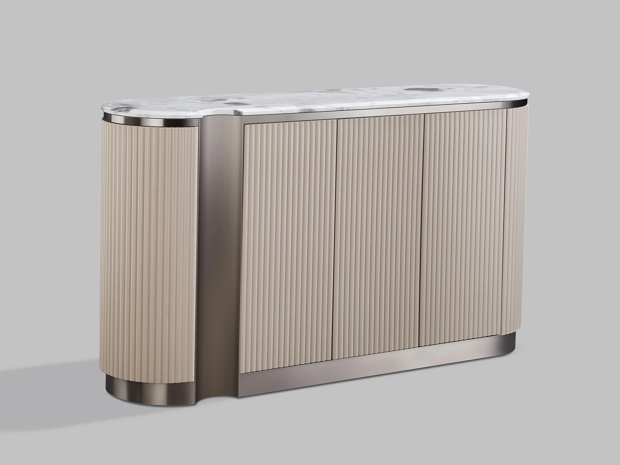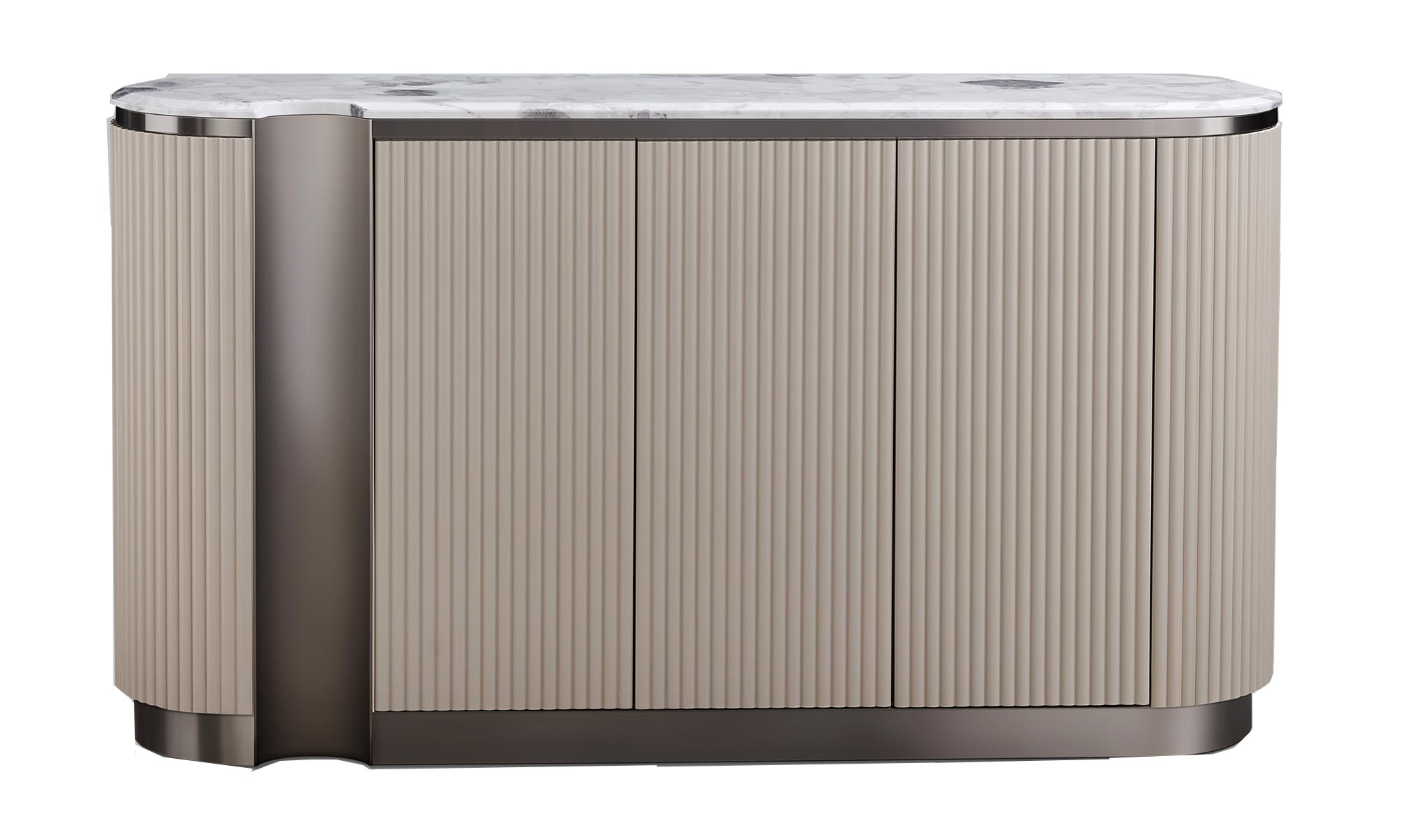 Komoda Eleganza w beżowym kolorze została zaprojektowana z dbałością o najdrobniejsze szczegóły. Dolny wieniec niklowany oraz marmurowy blat nadają jej elegancji i klasy, doskonale wpisując się w nowoczesne, jak i klasyczne aranżacje. Korpus komody wykonano z ryflowanego drewna, co podkreśla jej luksusowy charakter, a jednocześnie gwarantuje solidność konstrukcji. Wnętrze komody wyposażono w regulowane półki, co pozwala na dopasowanie przestrzeni do własnych potrzeb. Dodatkowo zastosowany system push to open i soft close zapewnia wygodę użytkowania i cichą pracę. Dzięki możliwości regulacji ślizgaczy meblowych, komoda sprawdzi się na każdej powierzchni, nie niszcząc podłogi.