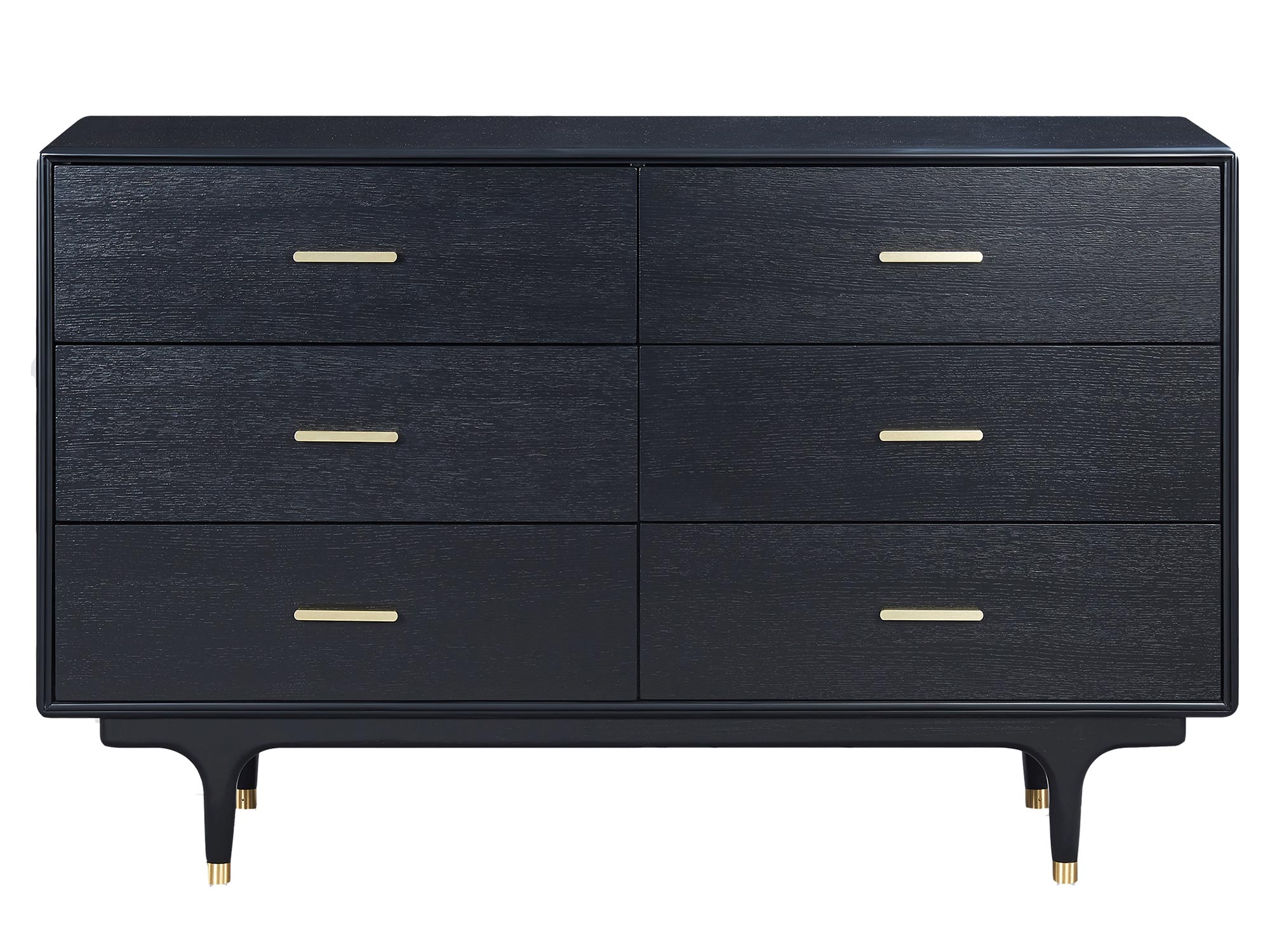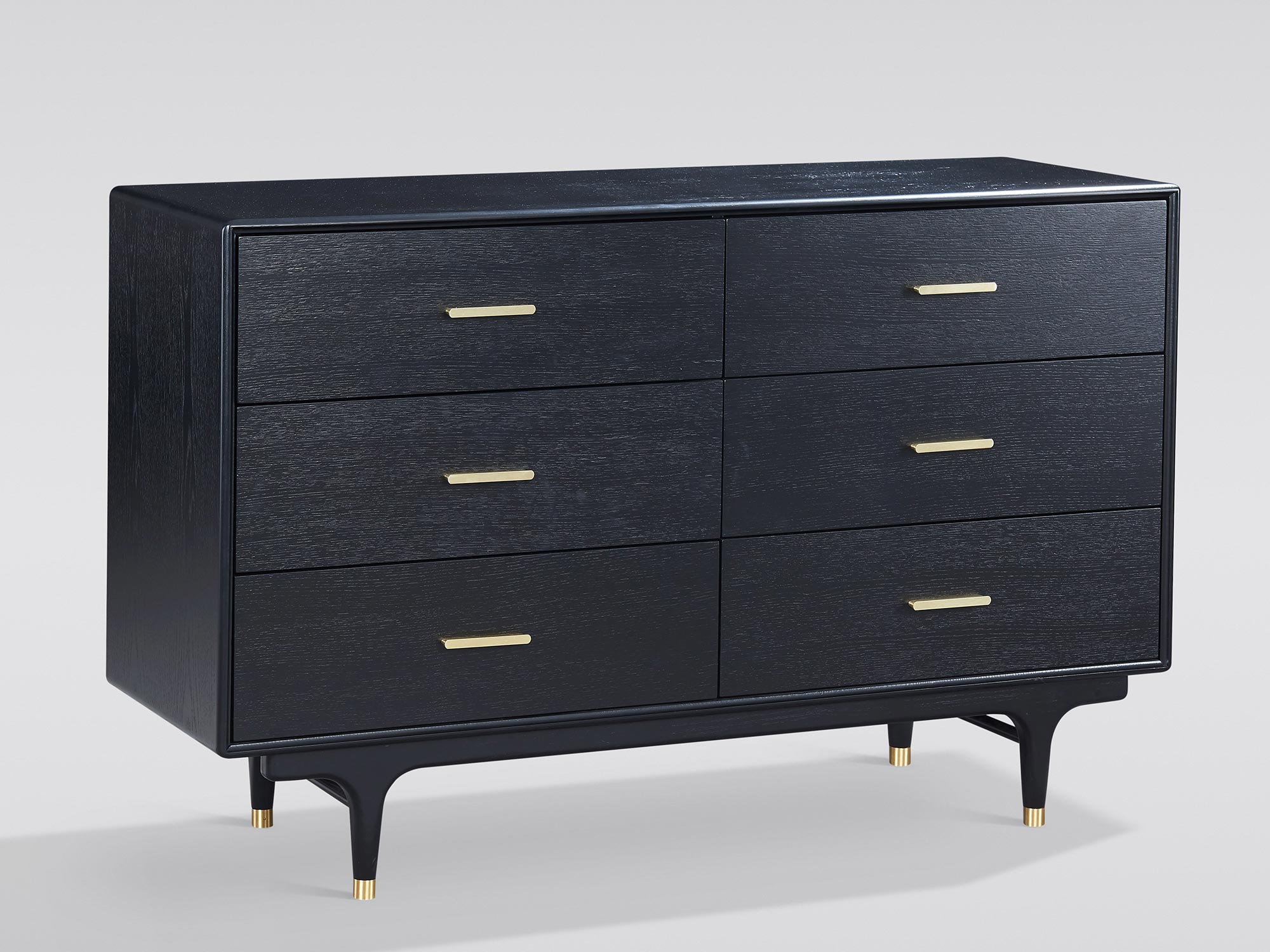 Oryginalna komoda w eleganckim, czarnym wykończeniu, ozdobiona złotymi nogami oraz uchwytami. Widoczna struktura drewna dodaje meblowi unikalnego charakteru, tworząc doskonałe połączenie nowoczesnego designu i klasycznej estetyki.