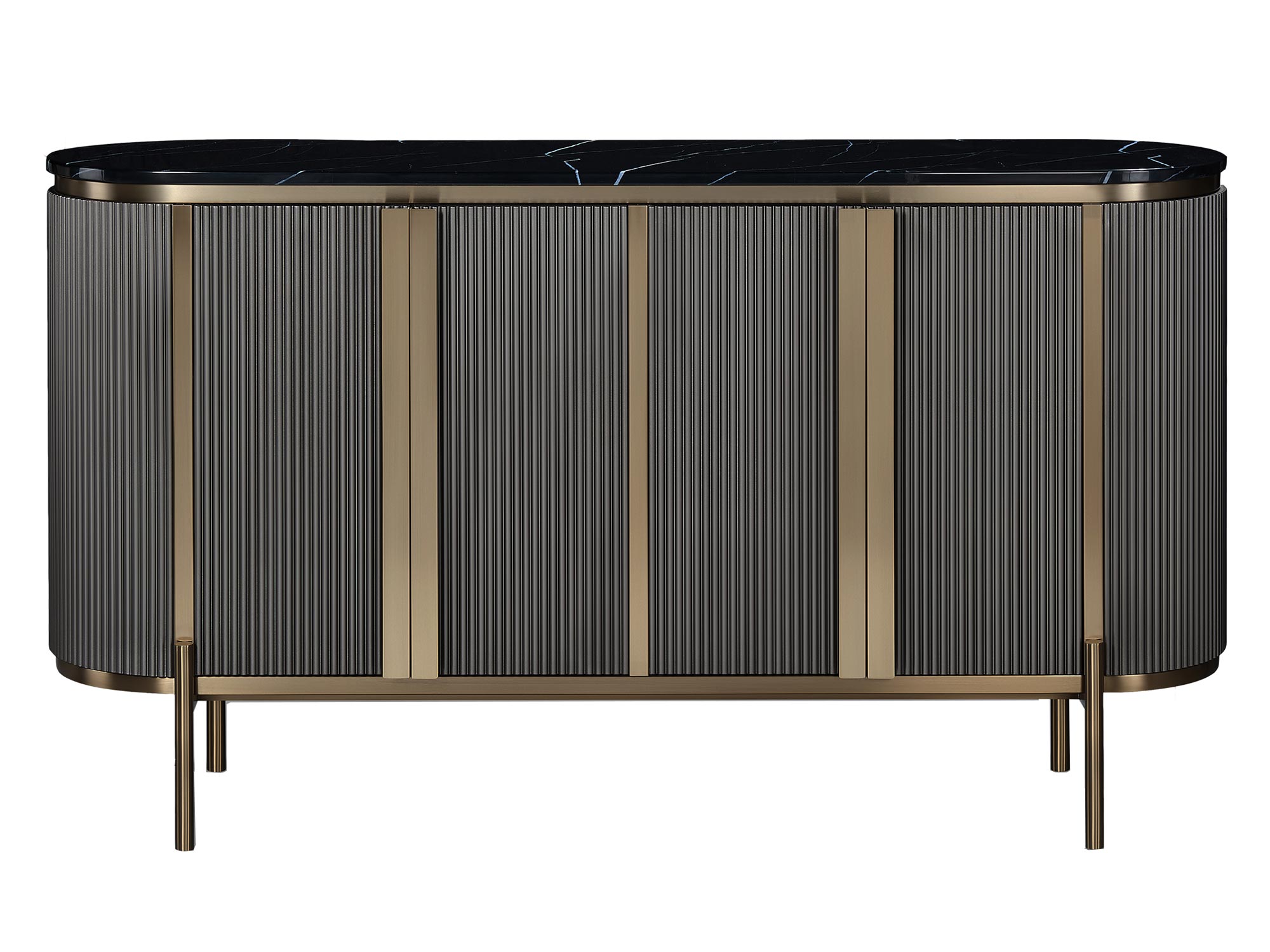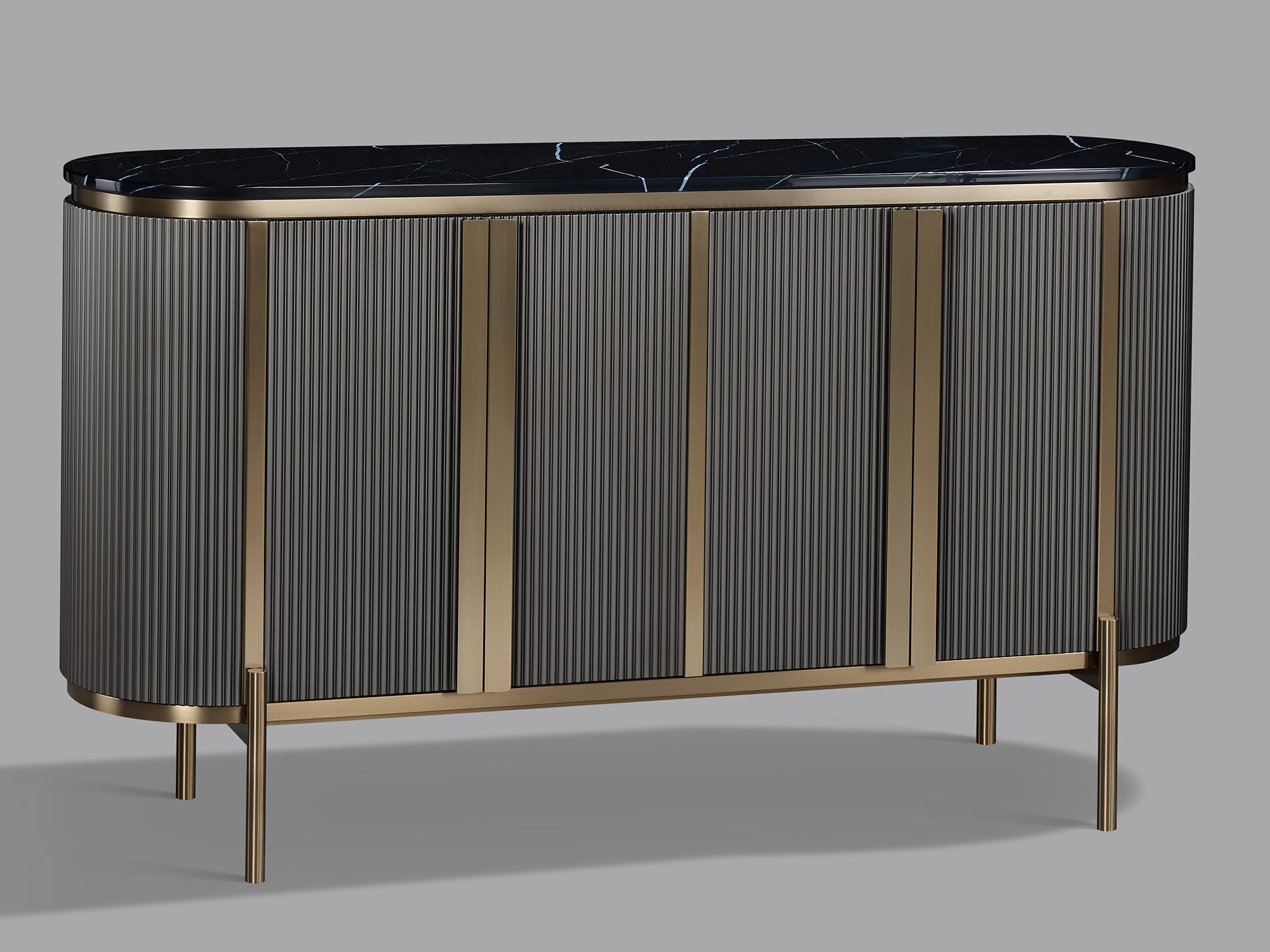Stylowa komoda w głębokim grafitowym kolorze z eleganckimi złotymi akcentami. Blat wykończony w marmurze oraz ryflowane drewno korpusu nadają jej niepowtarzalny charakter. To perfekcyjne połączenie nowoczesności z ponadczasową elegancją, które doskonale wkomponuje się w każdą aranżację wnętrza.