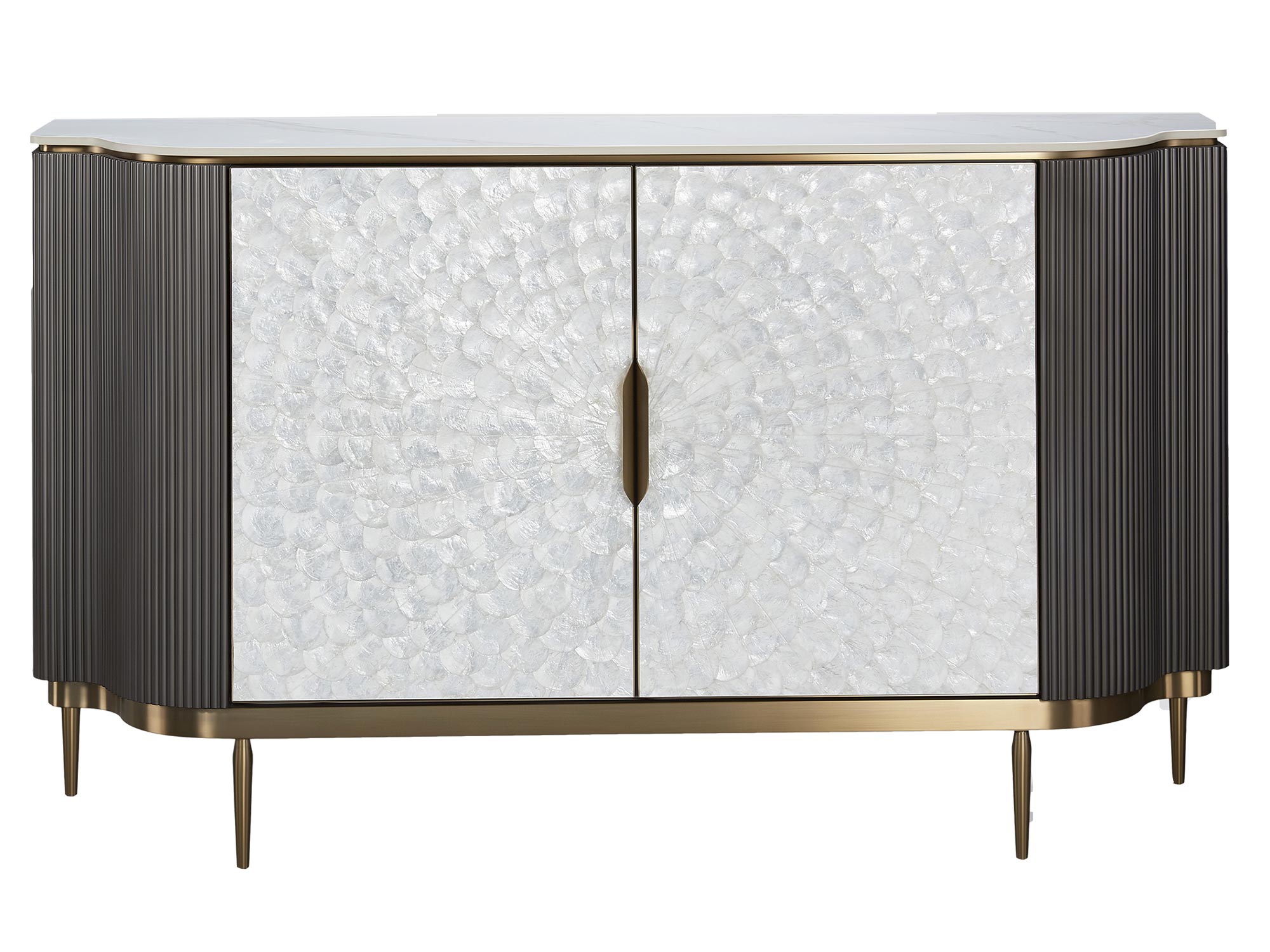 Stylowa komoda Eleganza w kolorze grafitowym to przykład wyjątkowego połączenia funkcjonalności z estetyką. Jej front wykonany jest z naturalnej muszli morskiej, układającej się w symetryczny wzór, a korpus zdobi ryflowane drewno. Całość dopełnia elegancki marmurowy blat, tworząc efektowną kompozycję, która wnosi powiew luksusu do każdego wnętrza.