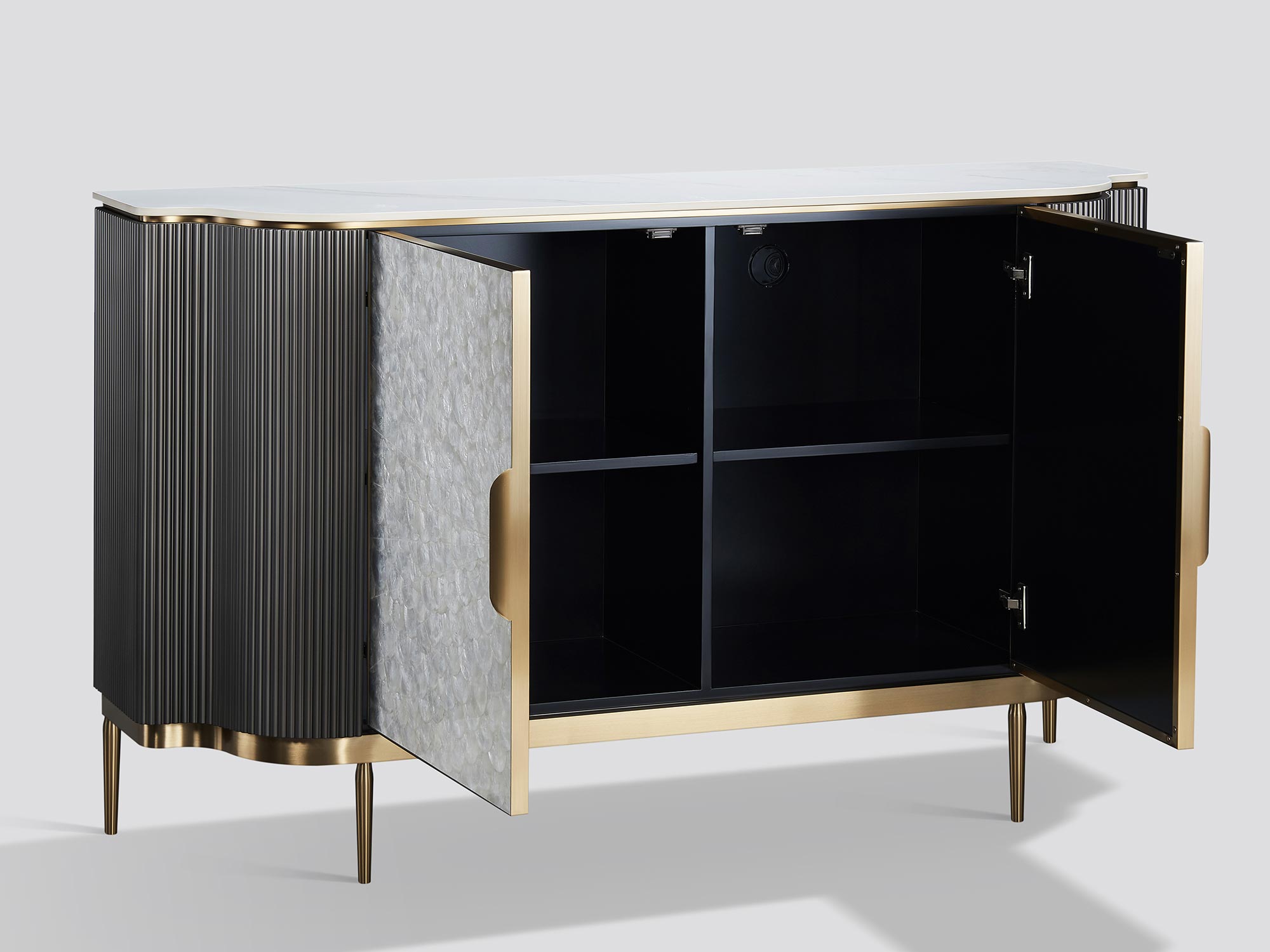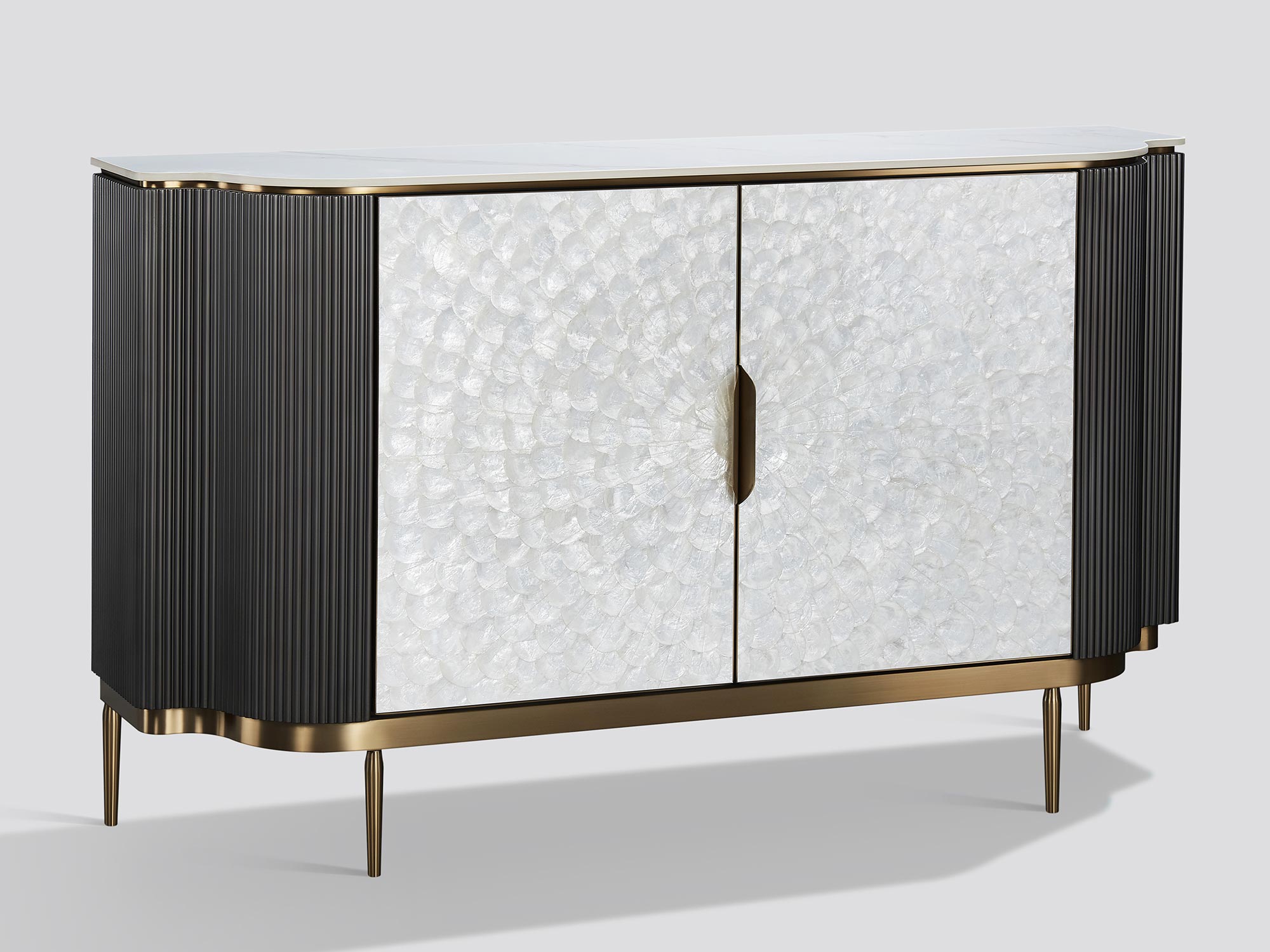 Komoda w kolorze ciemnego grafitu zachwyca naturalnym frontem z muszli morskiej oraz marmurowym blatem, który dodaje wnętrzu elegancji. Ryflowane drewno na bokach korpusu podkreśla nowoczesny charakter mebla. Dodatkowo, dzięki systemowi soft close oraz regulowanej wysokości półek, komoda łączy w sobie wyrafinowany styl z komfortem użytkowania.