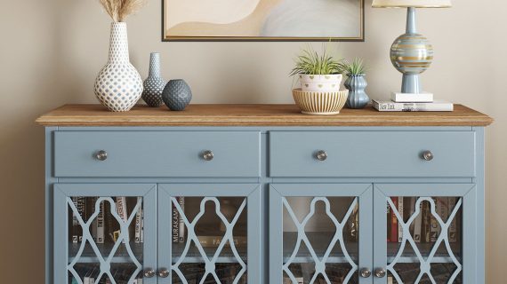 Aranżacja salonu z komodą w odcieniu błękitu z przeszkleniami w kratkę