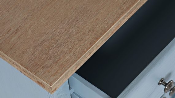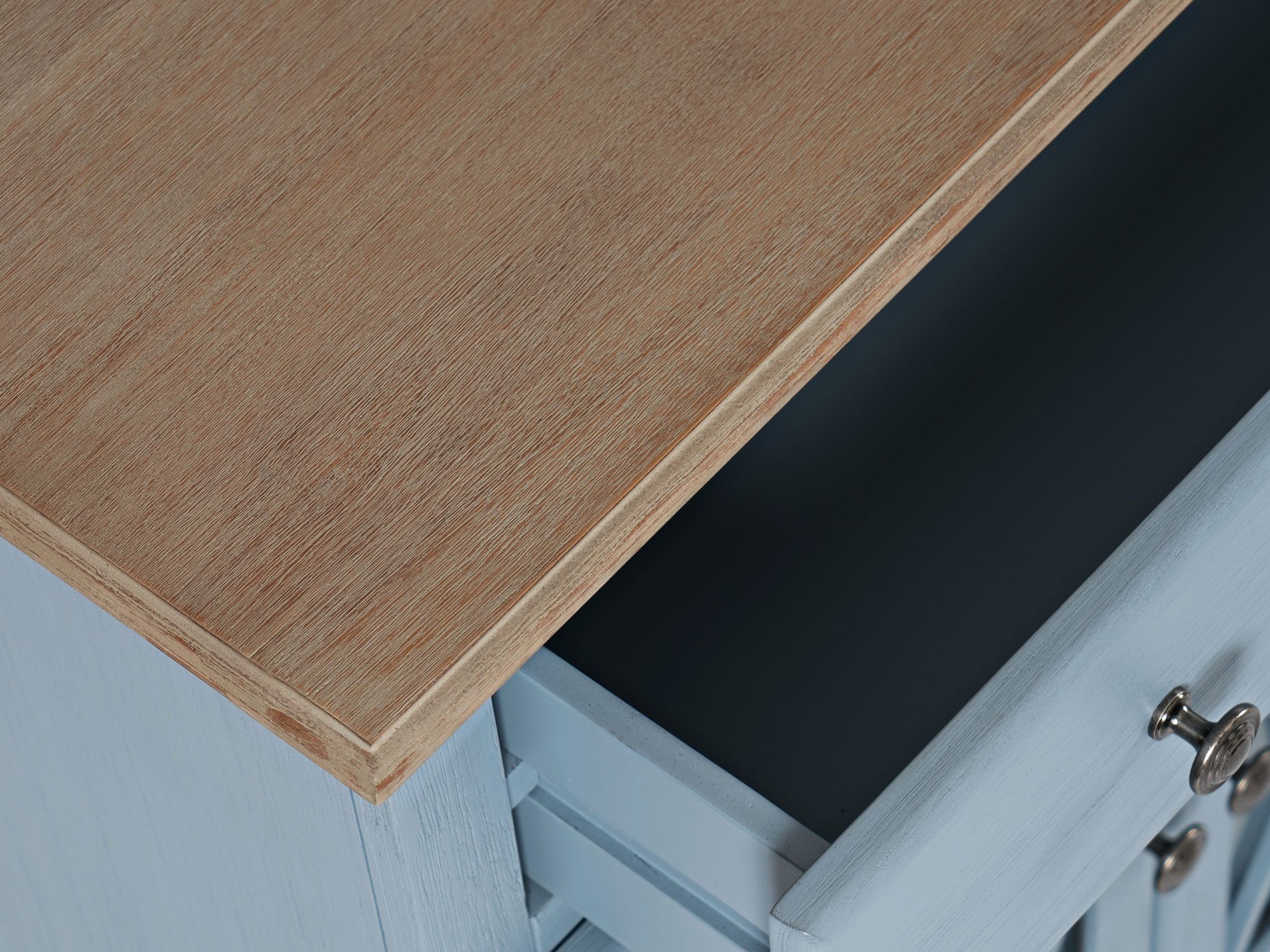 • Elegancki design: Jasnoniebieski kolor w połączeniu z jasnobrązowym blatem oraz ozdobnymi szprosami sprawia, że komoda pasuje do różnych stylów wnętrz.