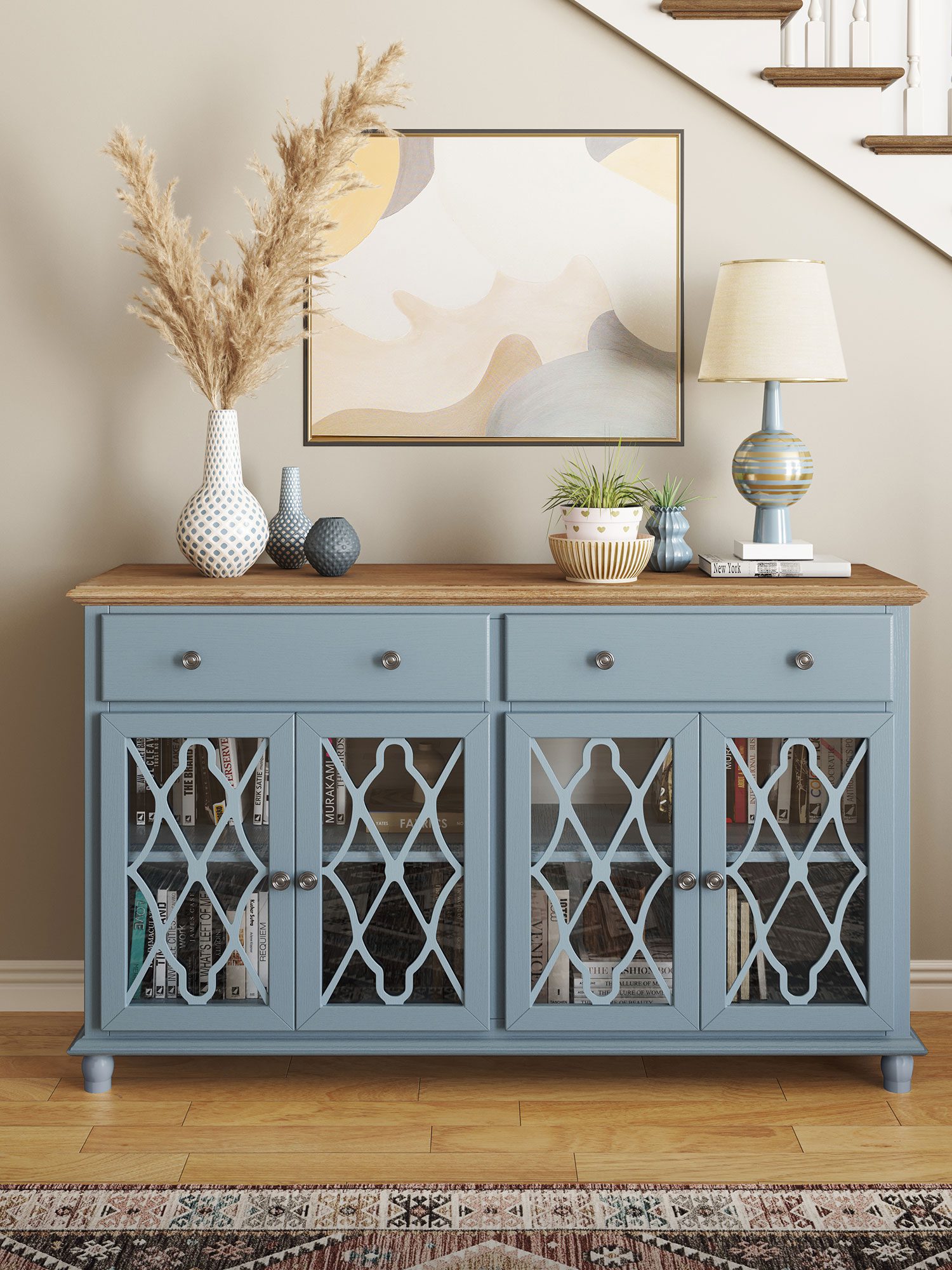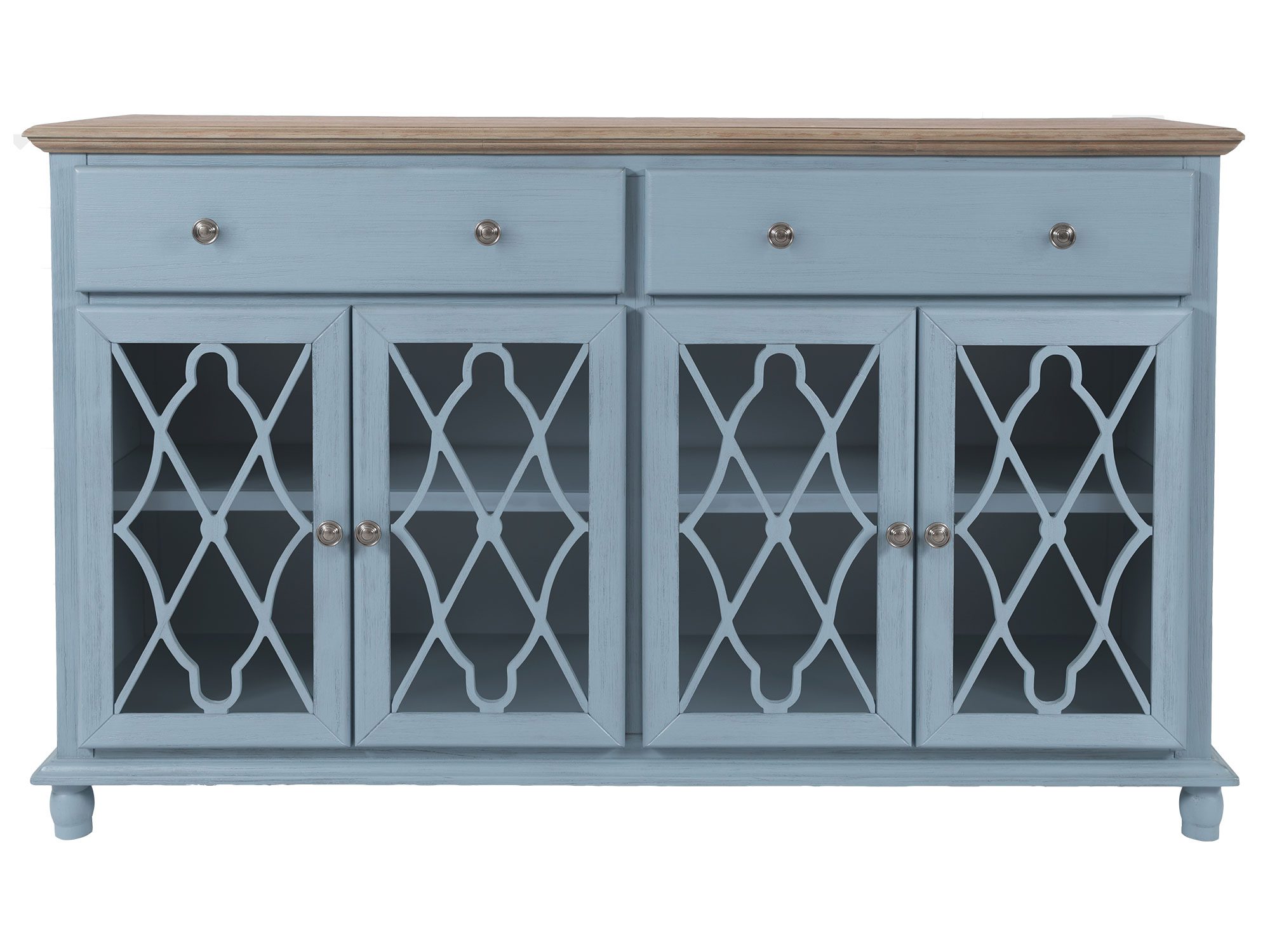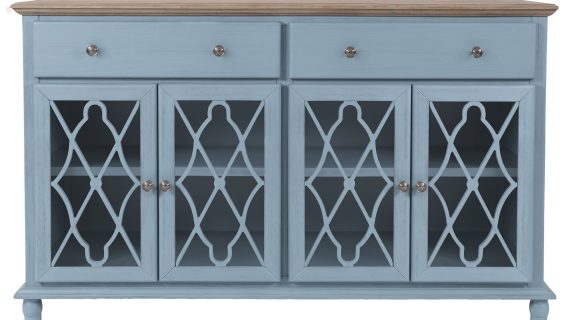 Elegancka i funkcjonalna komoda w stylu klasycznym, która doda uroku każdemu wnętrzu. Jej jasnoniebieska barwa w połączeniu z jasnobrązowym blatem stanowi idealne połączenie nowoczesności z tradycją. Czworo przeszklonych drzwi z ozdobnymi szprosami i dwie praktyczne szuflady zapewnią wystarczającą przestrzeń do przechowywania. To doskonały wybór dla osób szukających estetyki i funkcjonalności w jednym produkcie.