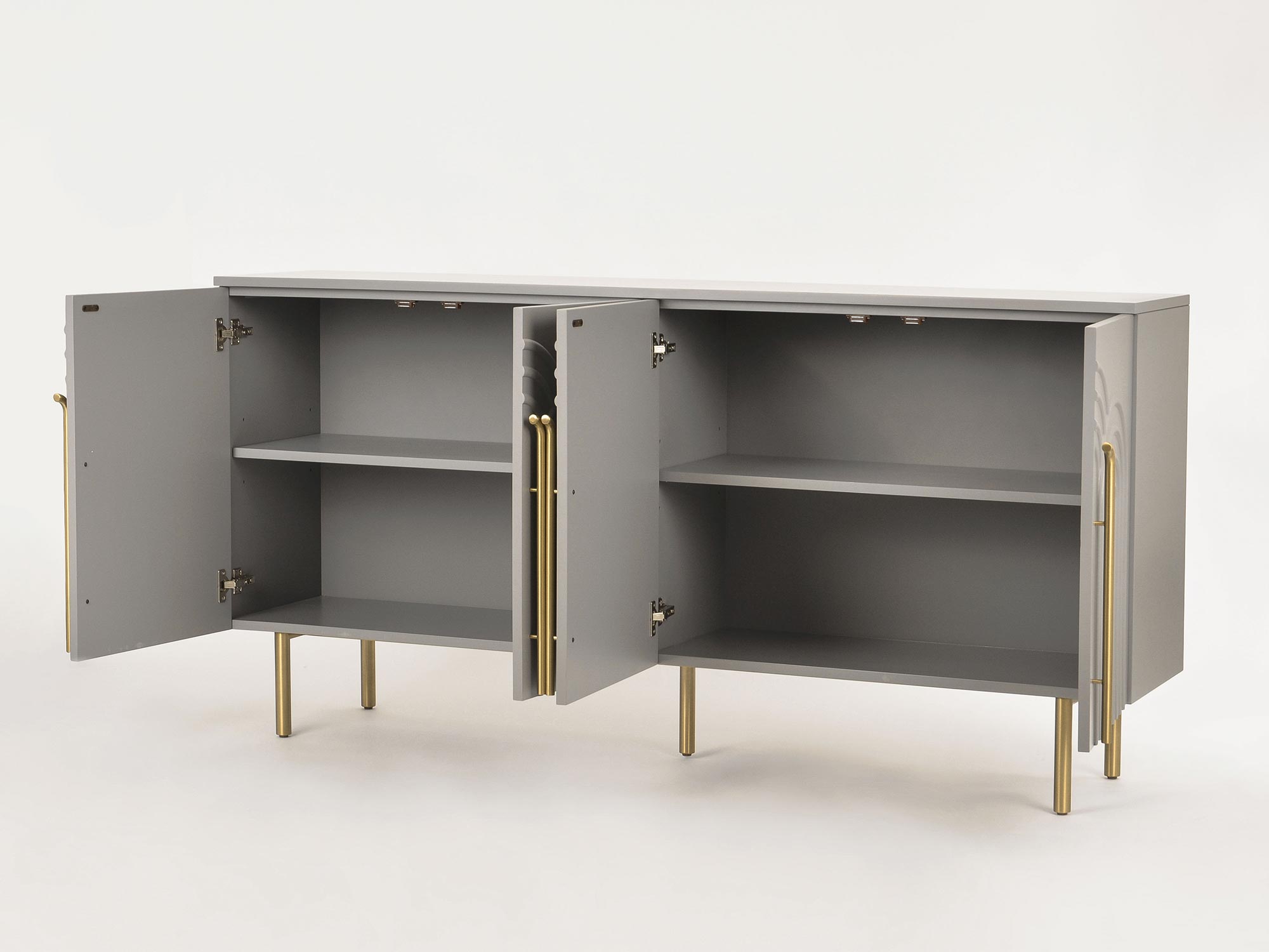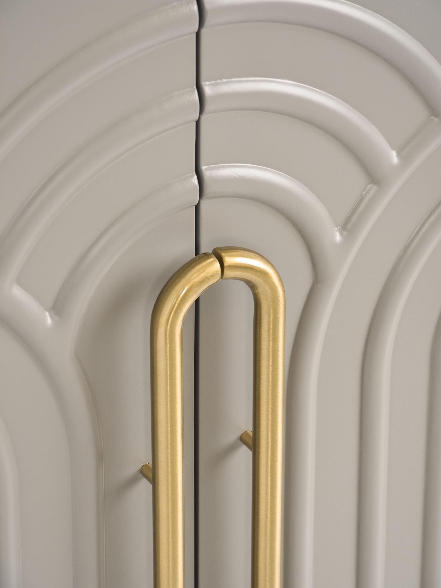 Eleganza to komoda, która łączy subtelną elegancję z funkcjonalnością. Wykonana z wysokiej jakości materiałów, komoda wyróżnia się jasnoszarym wykończeniem, które jest nie tylko modne, ale również ponadczasowe. Fronty drzwi zdobione są wytłoczonymi łukami, które w połączeniu z uchwytami o tym samym kształcie tworzą spójną całość. Złote akcenty na nogach i uchwytach dodają całości luksusowego charakteru. System push-to-open i regulowane półki to dodatkowe atuty, które zapewniają komfort użytkowania.