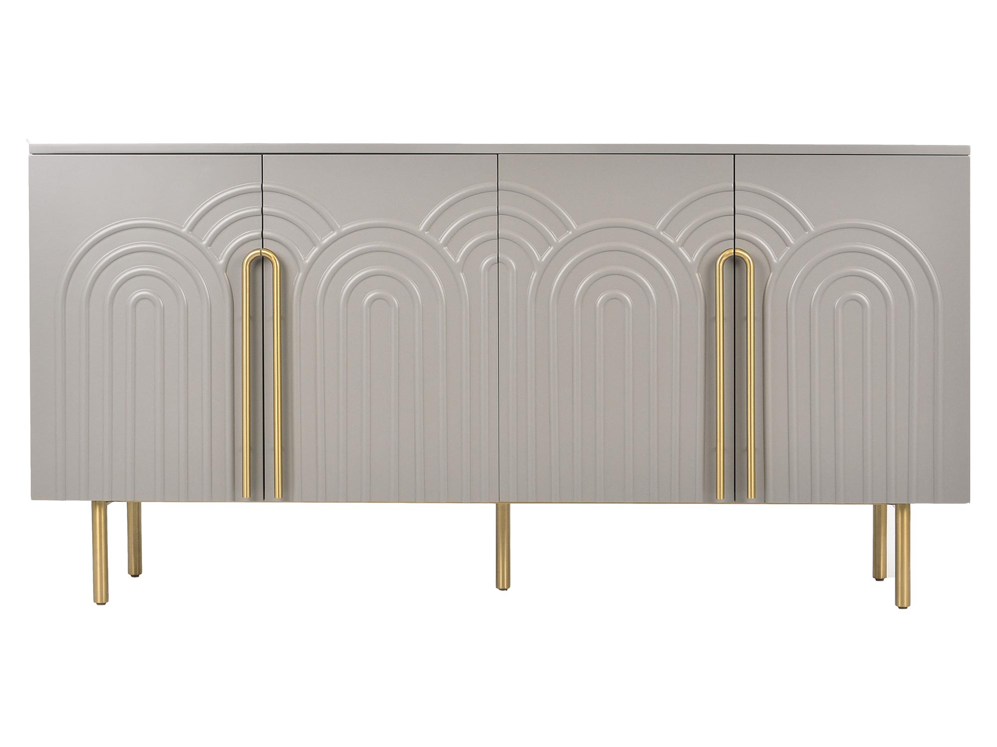 Komoda Jasnoszara z wytłoczonymi łukami to połączenie klasyki z nowoczesnością. Złote akcenty na uchwytach i nogach oraz delikatny wzór łuków na frontach drzwi nadają meblowi wyjątkowego charakteru, który doskonale komponuje się z eleganckimi wnętrzami. Dzięki swojej funkcjonalności i stylowemu designowi, komoda będzie idealnym wyborem do każdego nowoczesnego salonu lub sypialni.
