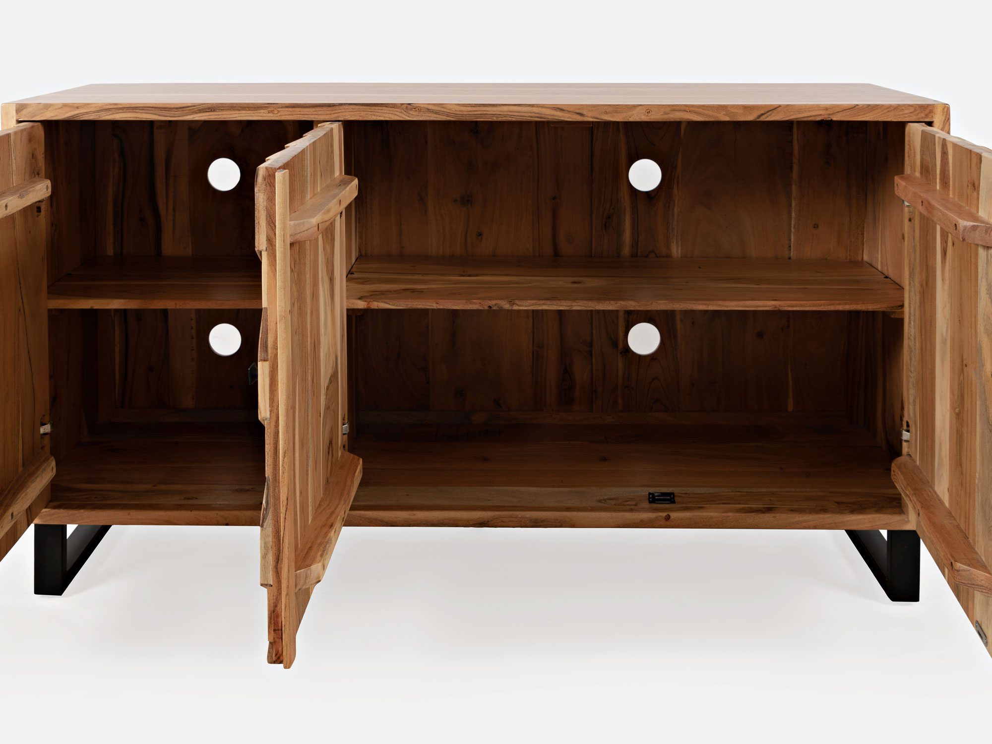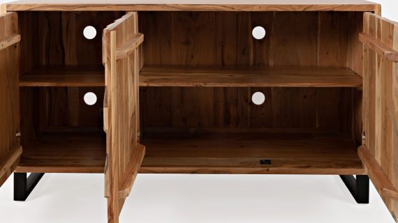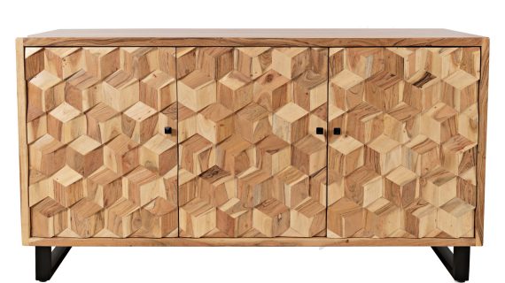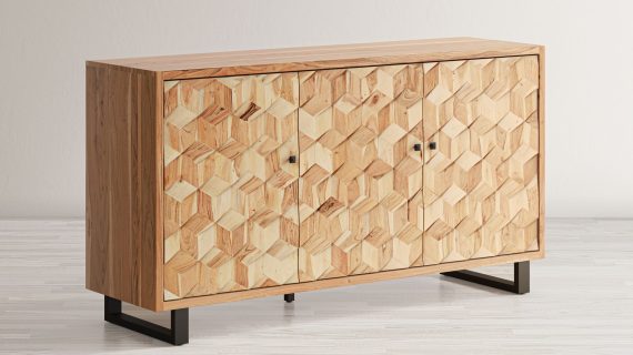 Elegancka komoda wykonana z naturalnego drewna akacji, charakteryzująca się frontem z intarsją, który podkreśla strukturę materiału. Żelazne nogi nadają jej industrialny charakter, a klasyczny wygląd łączy funkcjonalność z estetyką. Doskonała do nowoczesnych wnętrz, wprowadzi do Twojego domu naturalny ciepły akcent w połączeniu z surowym, industrialnym stylem.