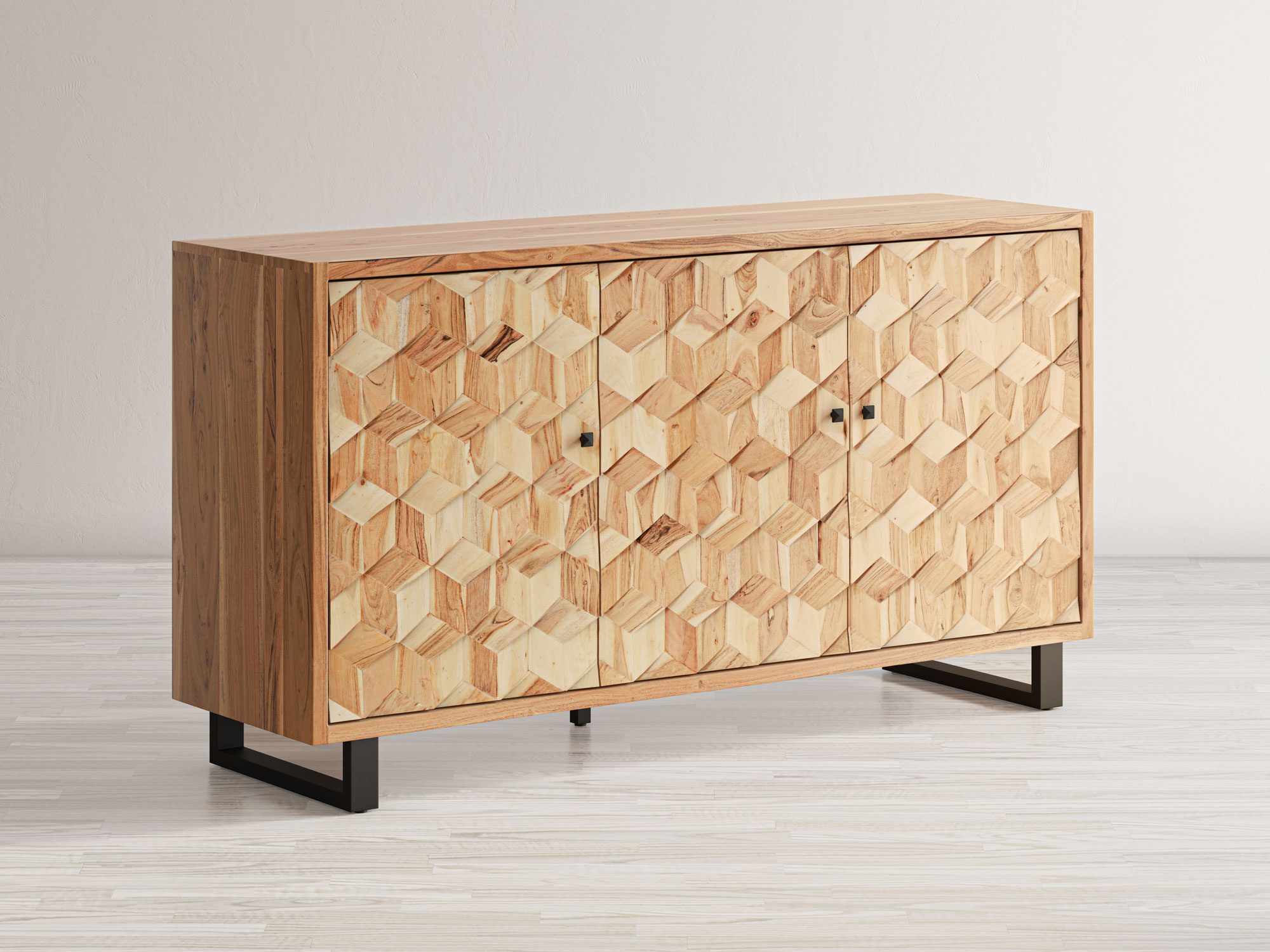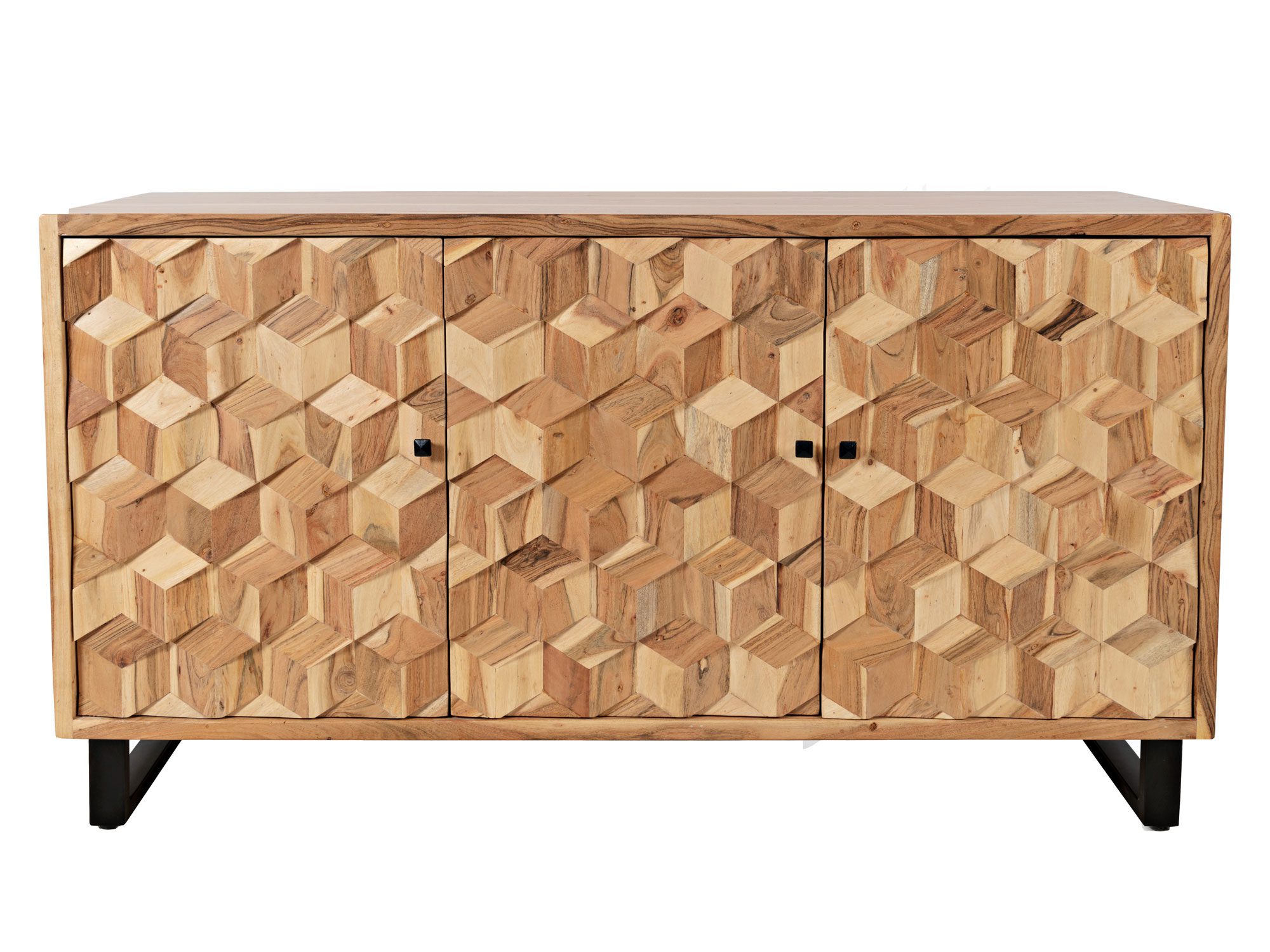 Ta komoda Avola to połączenie naturalnego drewna akacji z żelaznymi nogami, które nadają jej industrialnego charakteru. Front komody jest ozdobiony intarsją, która podkreśla naturalną strukturę drewna. Dzięki subtelnym detalom, takim jak 3D struktura na froncie, produkt wyróżnia się elegancją i oryginalnością. Żelazne nogi w czarnym kolorze doskonale komponują się z jasnym, naturalnym drewnem akacji, tworząc unikalny efekt wizualny. Komoda nie tylko pełni funkcję przechowywania, ale także stanowi piękny element dekoracyjny w każdym pomieszczeniu.