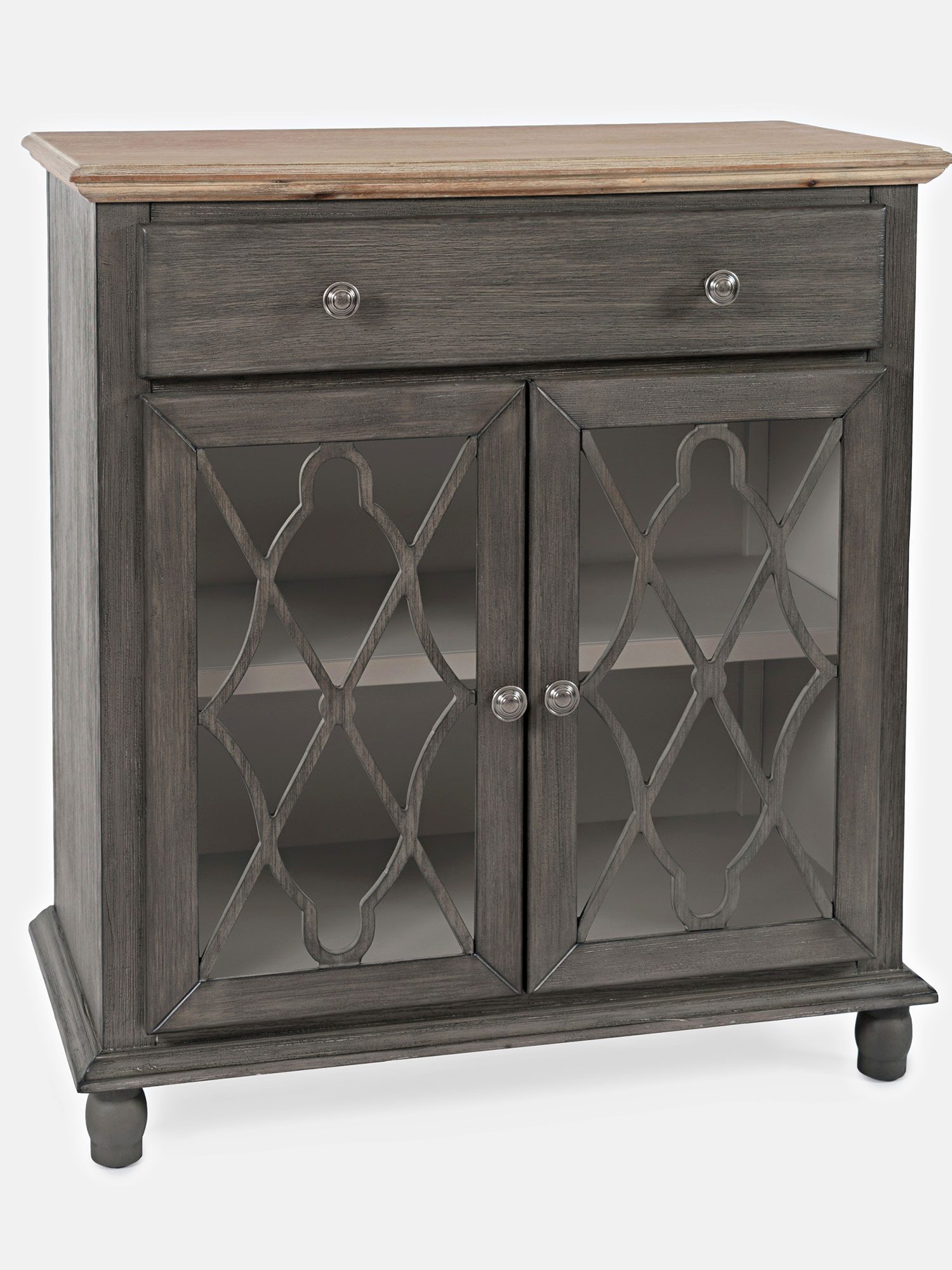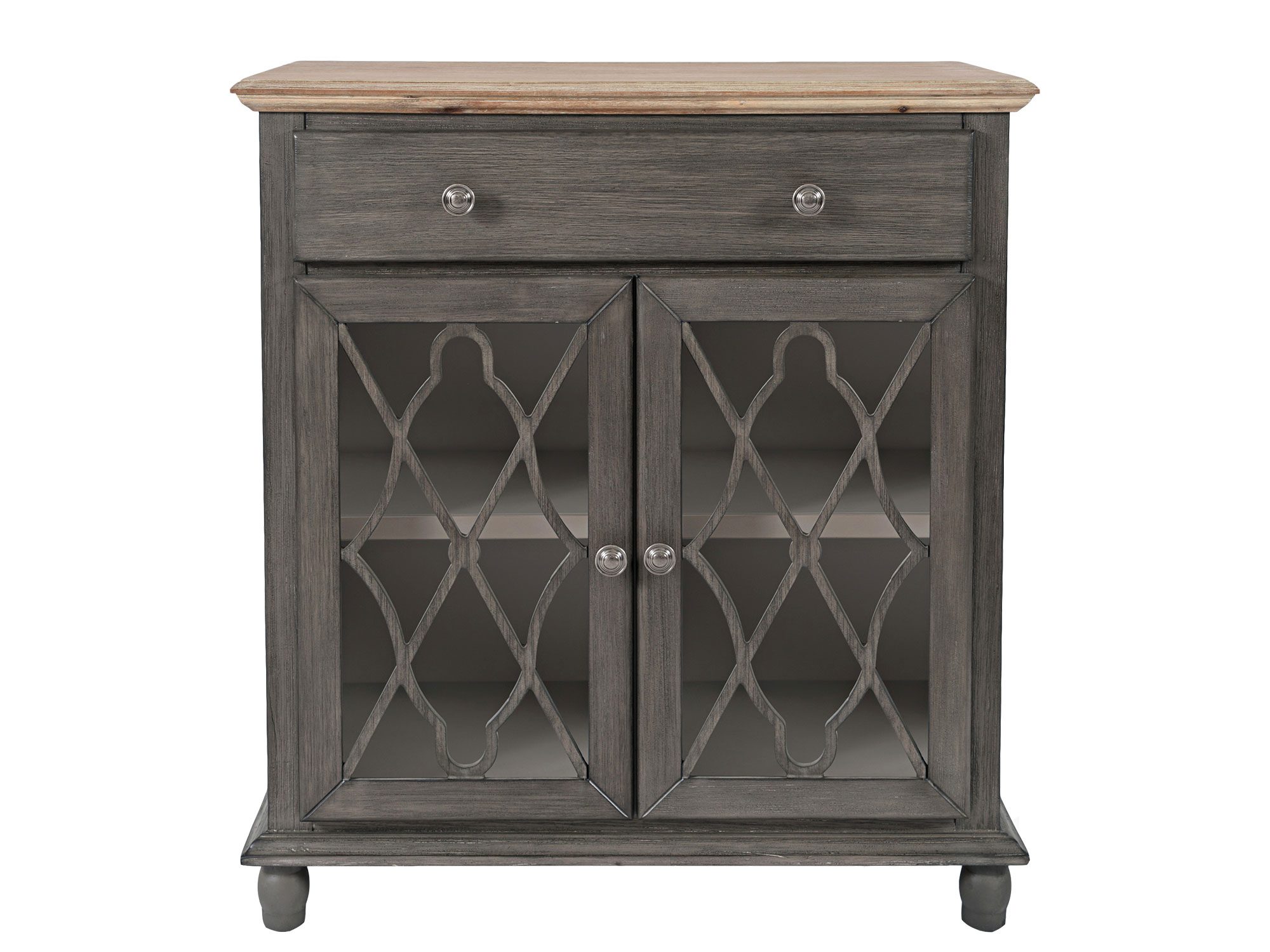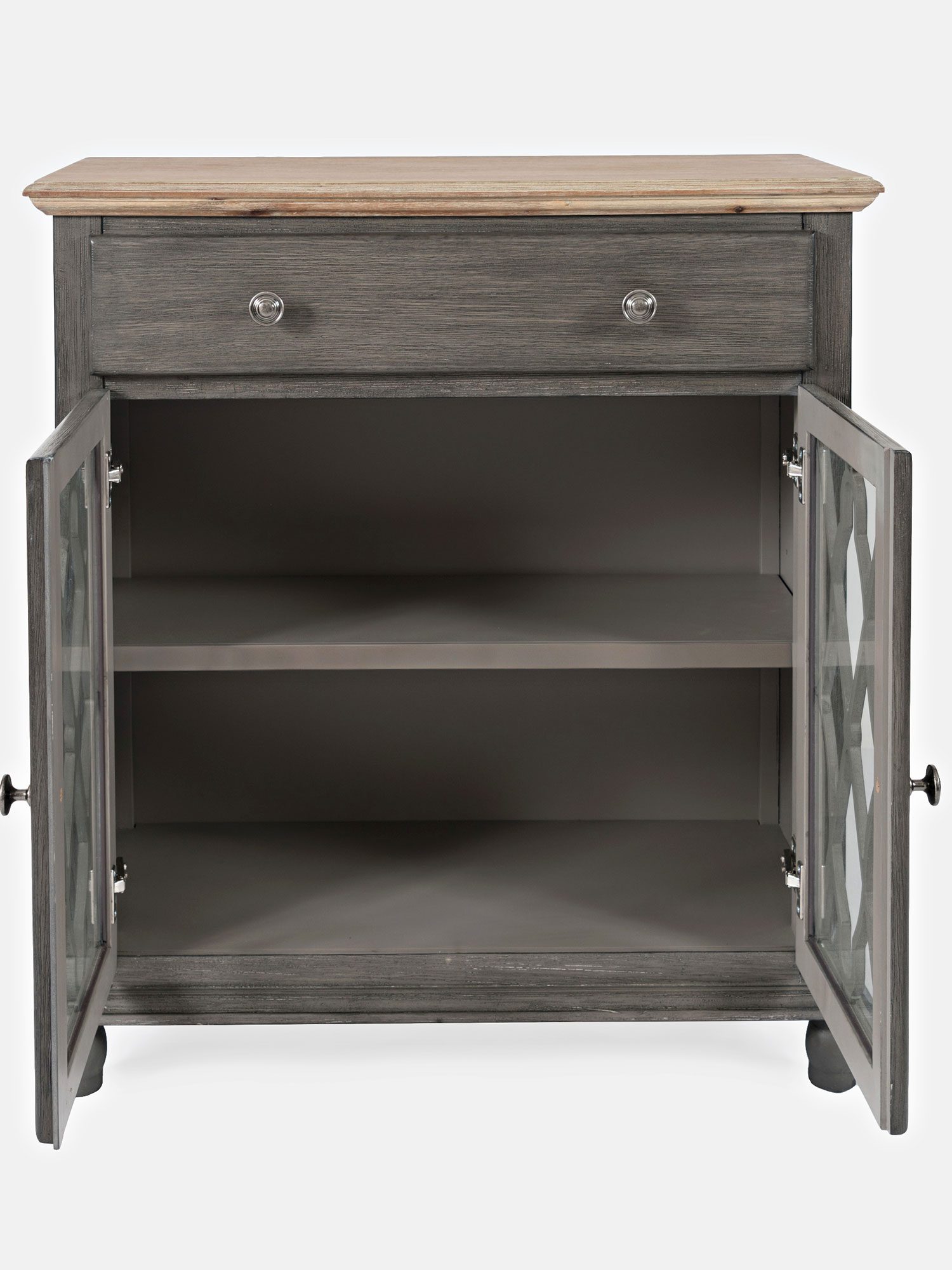 Komoda brązowoszara z jasnobrązowym blatem i przeszklonymi drzwiami – Avola