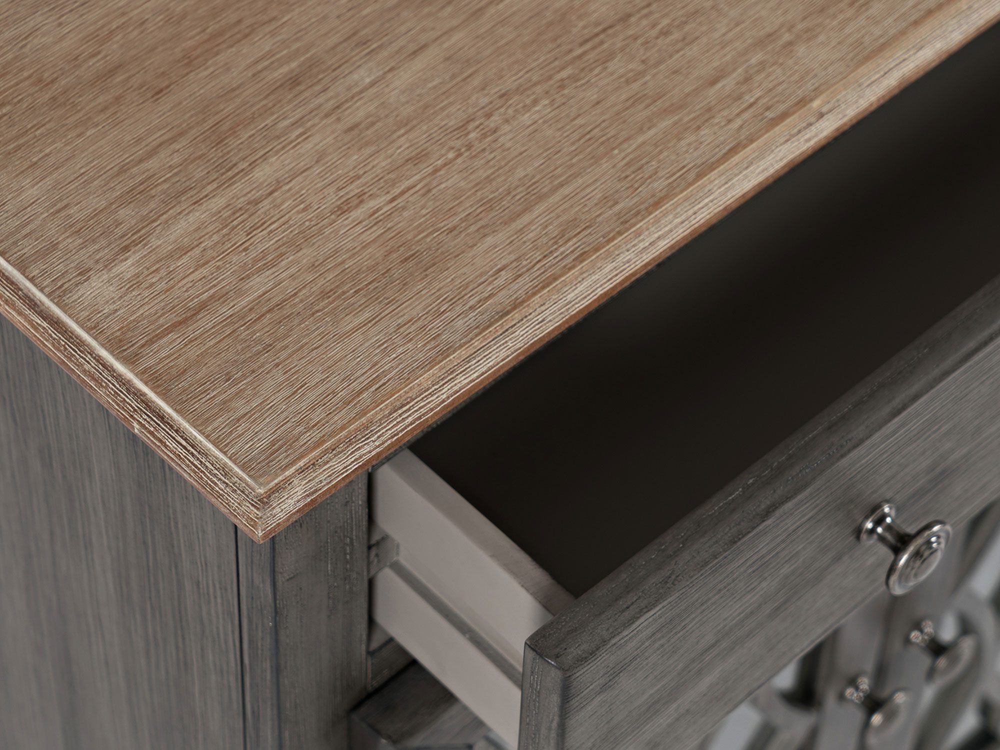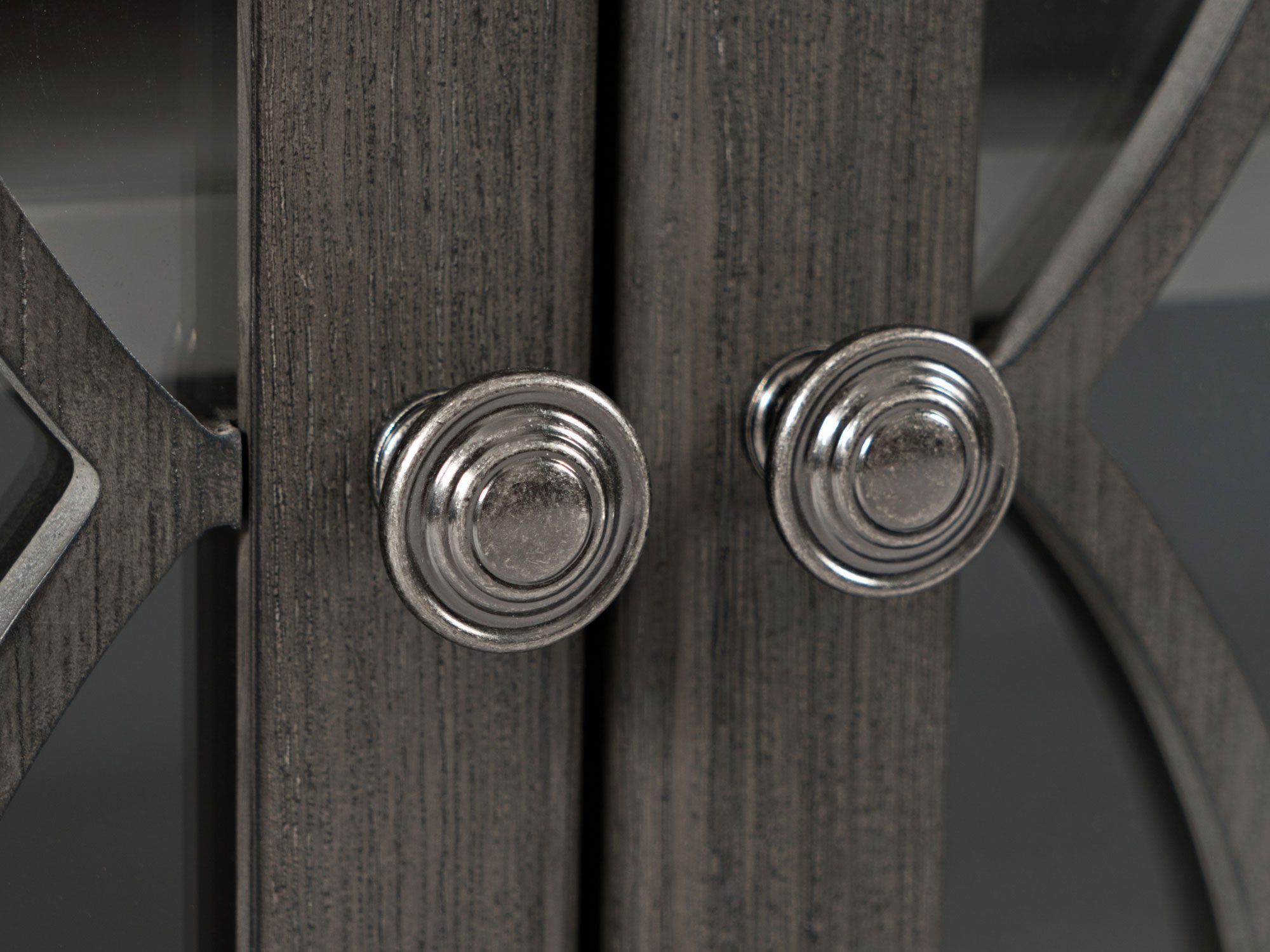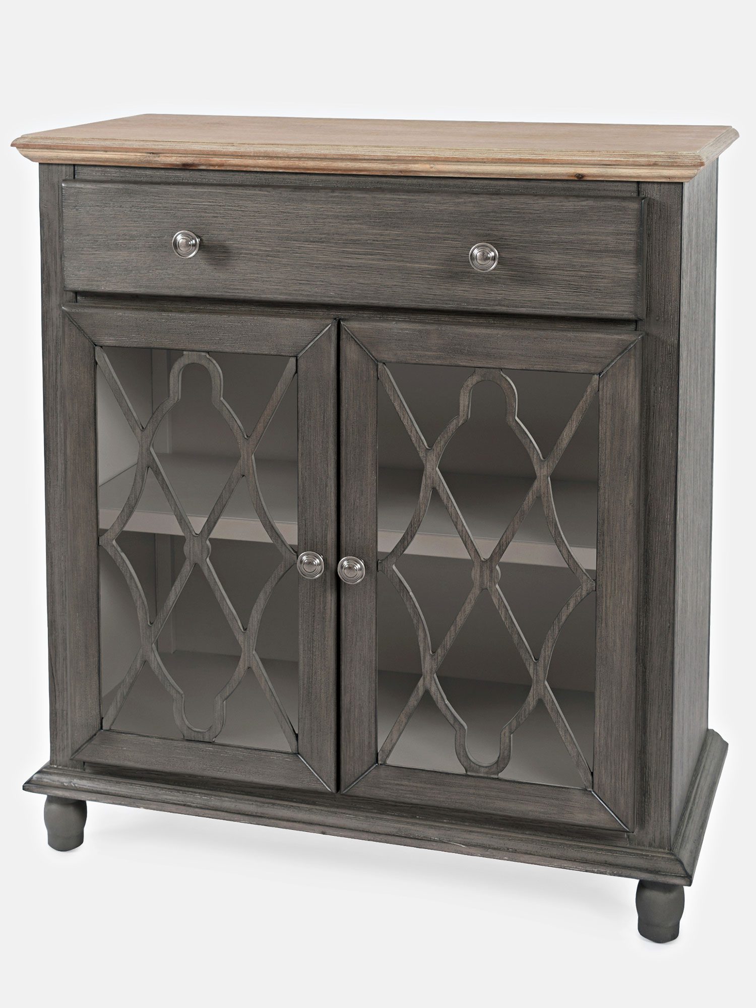 Komoda brązowoszara z jasnobrązowym blatem i przeszklonymi drzwiami – Avola