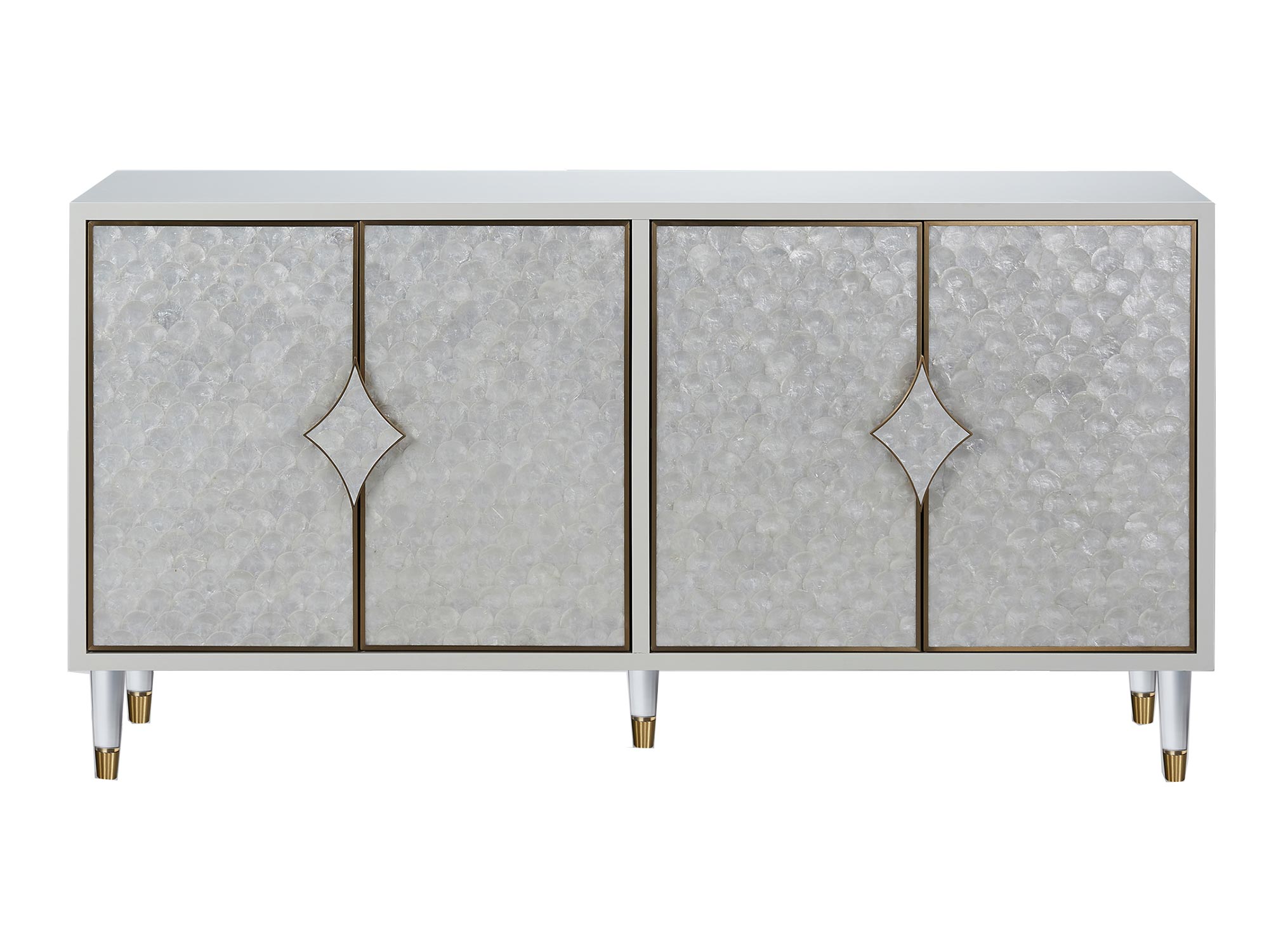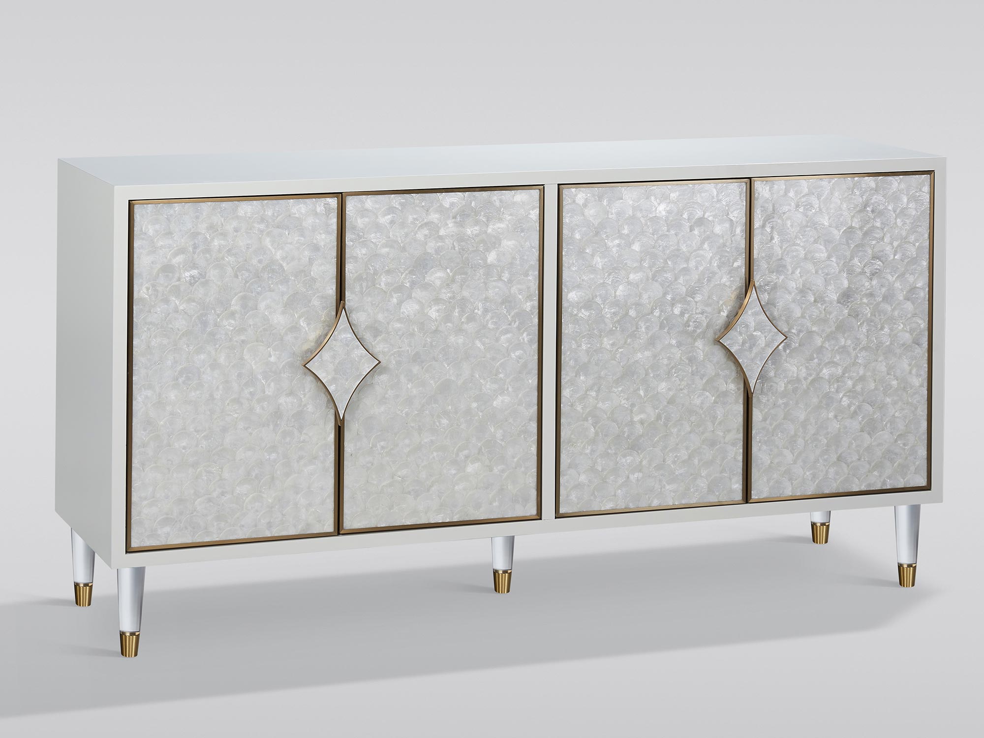 Komoda Eleganza to unikalne połączenie subtelnej elegancji i wyjątkowego designu. Fronty wykonane z naturalnej muszli morskiej układają się w intrygujący wzór przypominający rybie łuski, a złote akcenty i nóżki dodają jej ekskluzywnego charakteru. Ten mebel przyciągnie wzrok każdego gościa i stanie się ozdobą Twojego wnętrza.