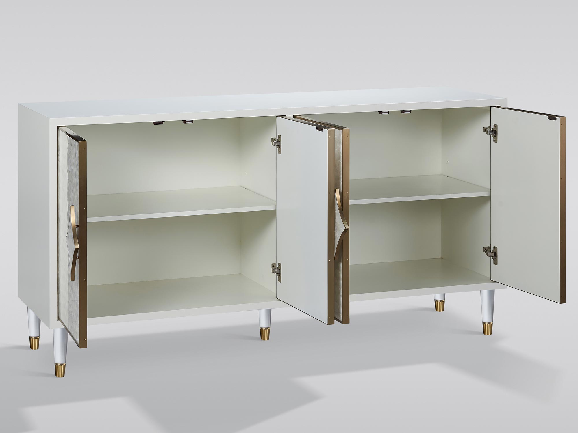Komoda Eleganza to przykład kunsztownego wzornictwa. Fronty z muszli morskiej, ułożone w geometryczny wzór, przywodzą na myśl rybie łuski, tworząc efektowną teksturę 3D. Złote listwy delikatnie podkreślają kontury, a uchwyty w kształcie karo dodają całości luksusowego wyrazu. Subtelne białe ecru idealnie komponuje się z ciepłymi, złotymi detalami, tworząc harmonię kolorów i kształtów.