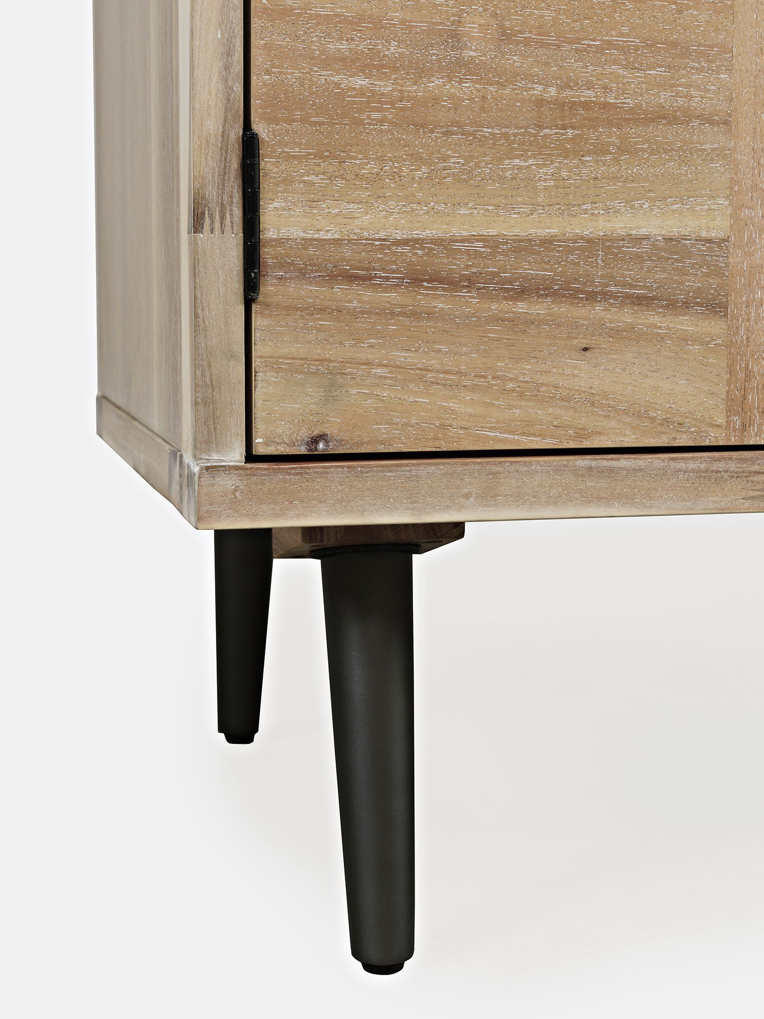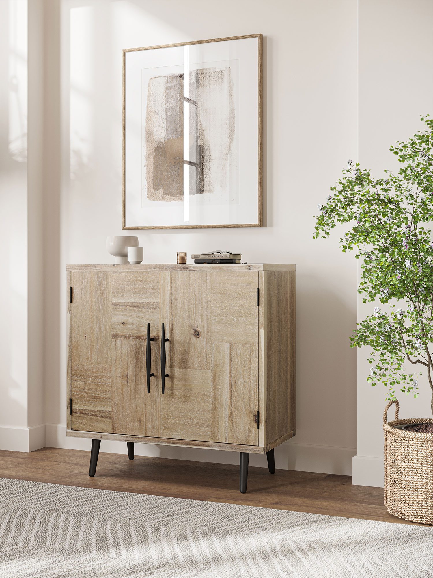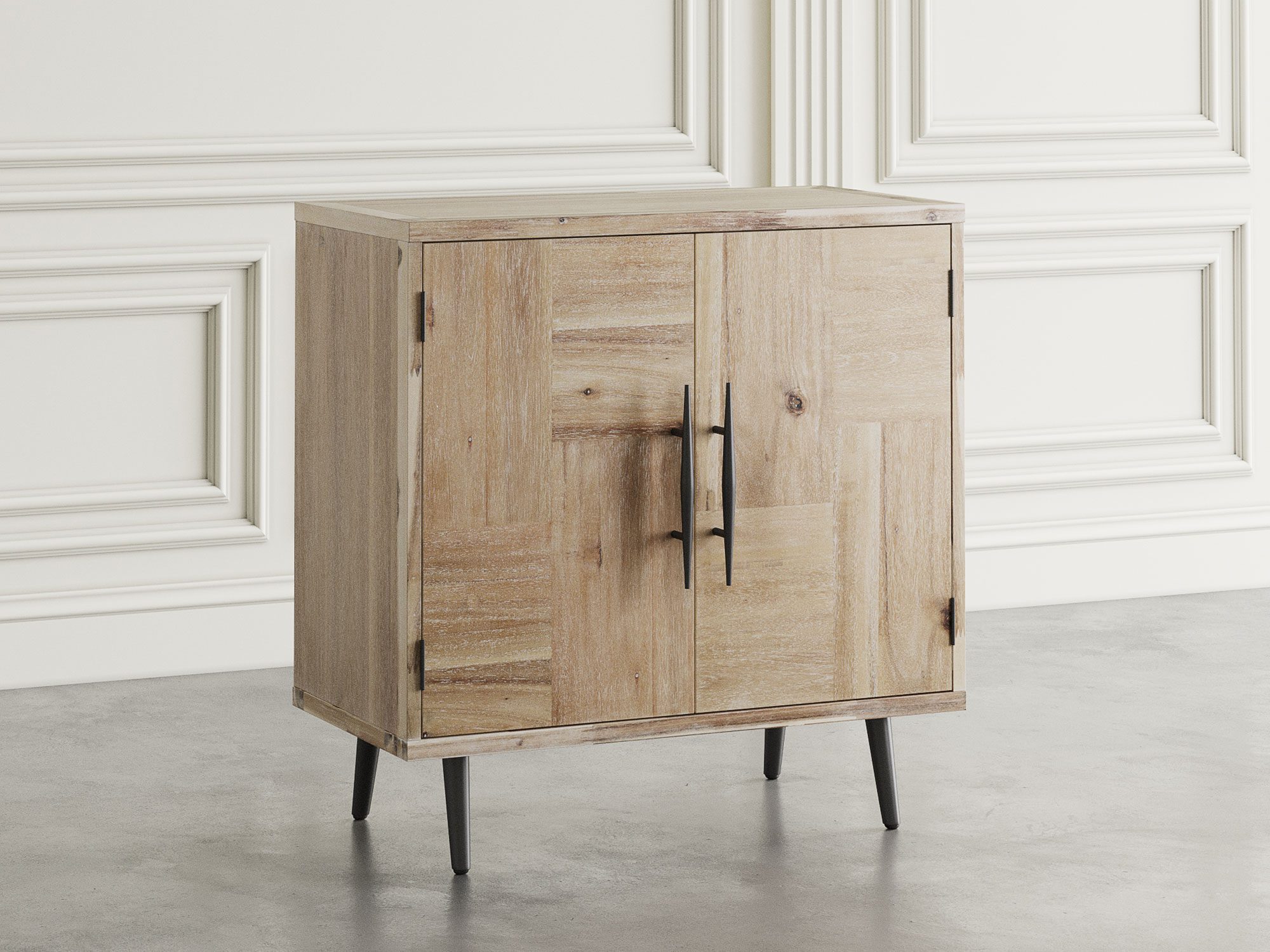 Elegancka komoda w stylu Mid-Century Modern, łącząca klasyczne elementy z nowoczesnym designem. Wykonana z wysokiej jakości drewna akacji, stoi na smukłych czarnych nóżkach, co nadaje jej lekkiego i subtelnego charakteru. Fronty z intarsją nawiązującą do wzoru parkietowego przyciągają wzrok, akcentując prostą, ale elegancką formę mebla. To idealny wybór do wnętrz, które cenią ponadczasowy styl oraz funkcjonalność.