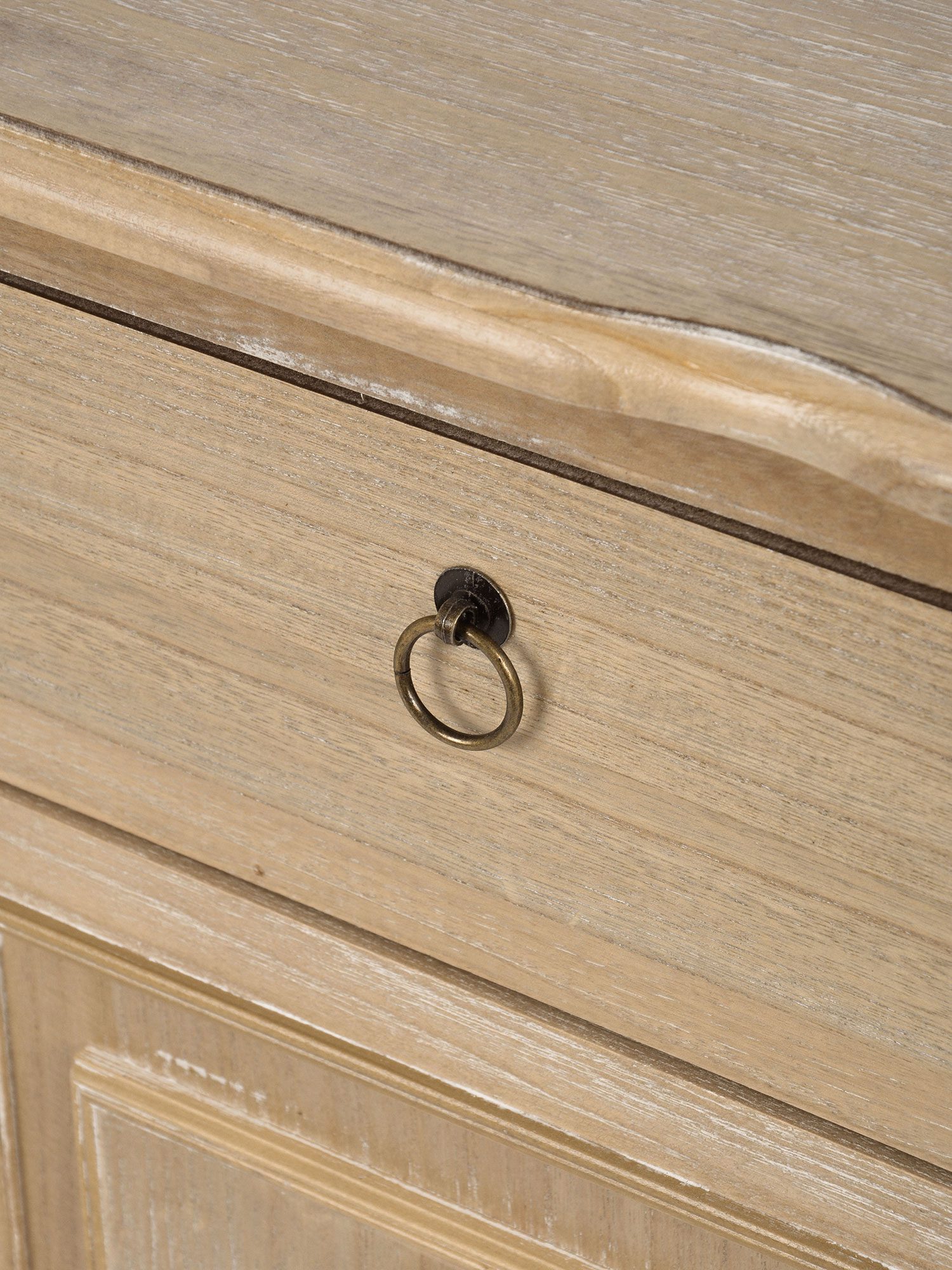 Komoda Viva to doskonały wybór dla osób, które cenią sobie elegancję i funkcjonalność w jednym. Wykonana z wysokiej jakości bielonego drewna paulowni, charakteryzuje się subtelnym szczotkowaniem oraz delikatnymi przetarciami, które nadają jej unikalny, vintage’owy wygląd. Jasnobrązowy blat świetnie komponuje się z resztą konstrukcji, wprowadzając naturalny akcent do wnętrza. Rzeźbienia na frontach szuflad oraz ozdobne metalowe uchwyty w kształcie gałek nadają komodzie wyjątkowego charakteru. Gięte nóżki zapewniają stabilność i lekkość, sprawiając, że komoda staje się doskonałym elementem wyposażenia jadalni, salonu czy przedpokoju.