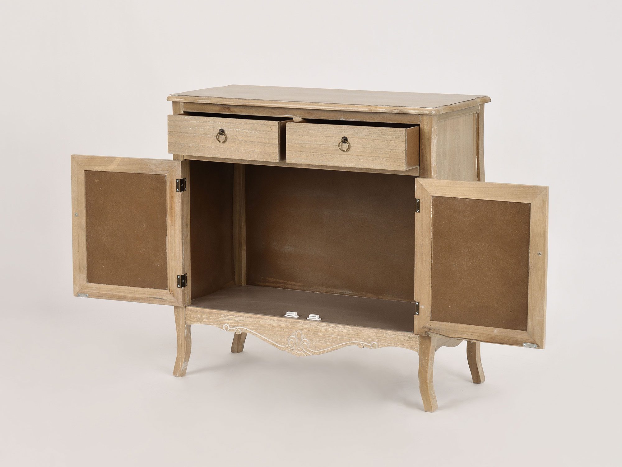Komoda Viva to doskonały wybór dla osób szukających eleganckiego, ale również funkcjonalnego mebla do swojego wnętrza. Wykonana z bielonego drewna paulowni, z pięknymi rzeźbieniami oraz metalowymi uchwytami w kształcie gałek, komoda z pewnością przyciągnie wzrok i stanie się centralnym punktem w Twoim domu. Gięte nogi nadają jej lekkości, a subtelne przetarcia na powierzchni wprowadzają do wnętrza rustykalny urok. Idealna do przechowywania naczyń, książek czy dekoracji. Zamów ją już teraz, aby cieszyć się jej pięknem i trwałością przez wiele lat!