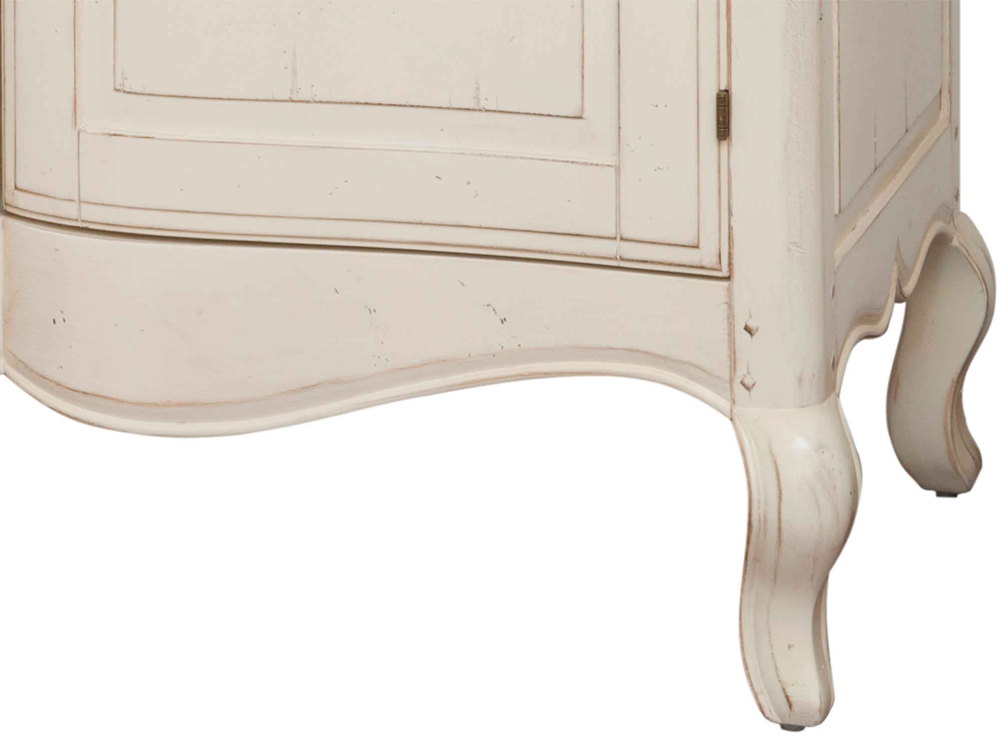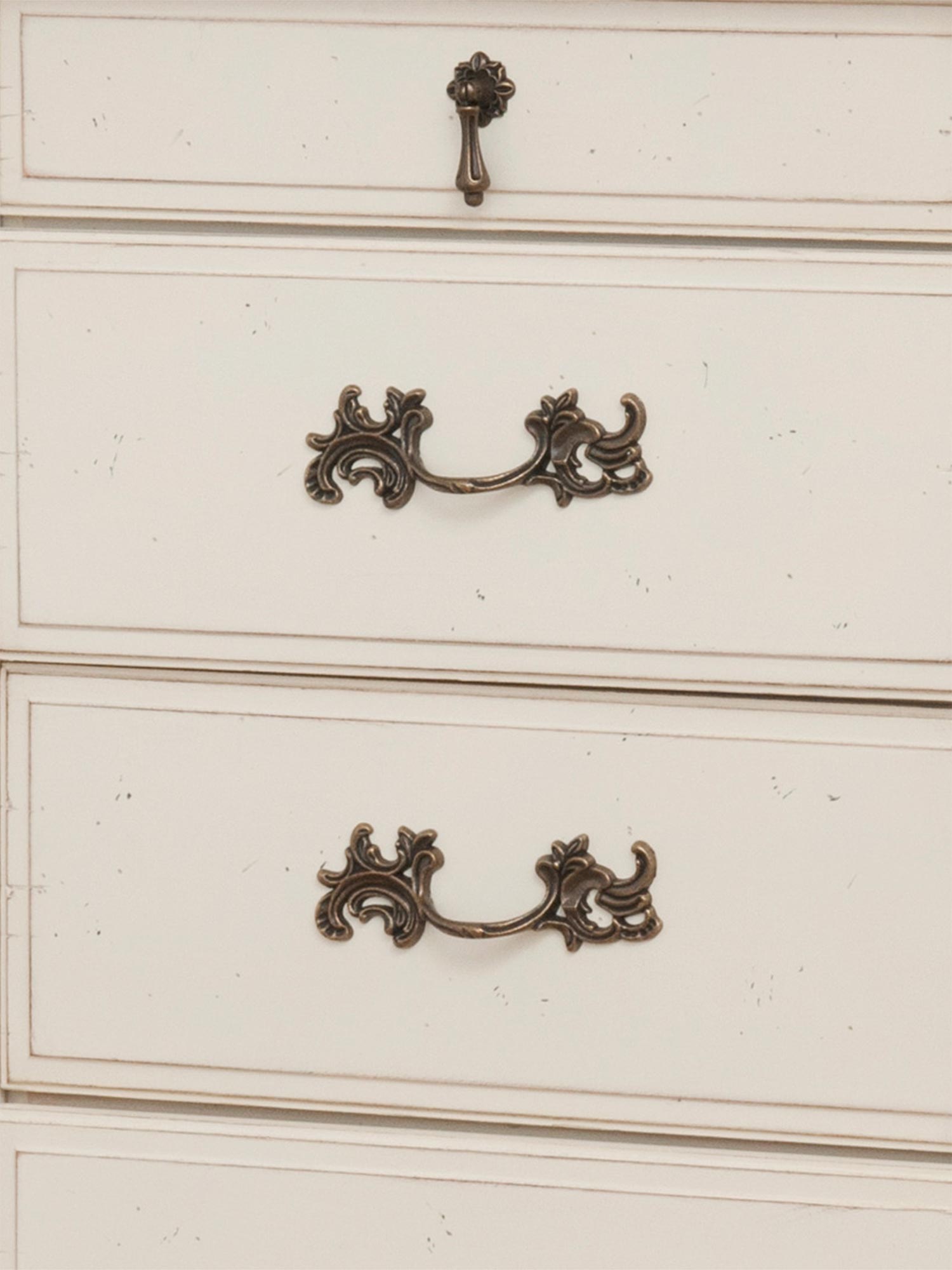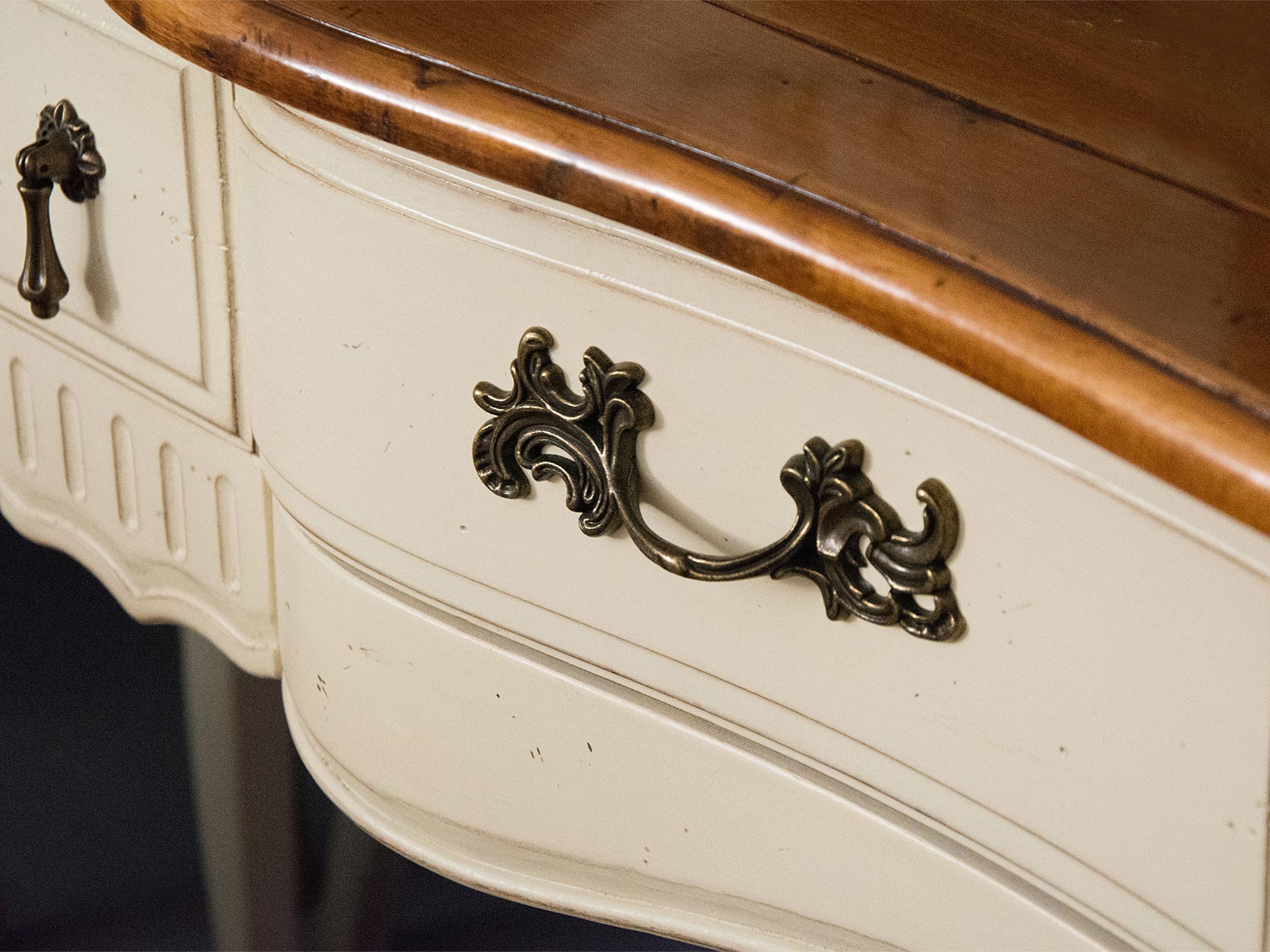 - Inne szczegóły: Aksamitne wyłożenie szuflad, metalowe uchwyty w kolorze ciemnego mosiądzu, gięte nóżki, przecierany korpus